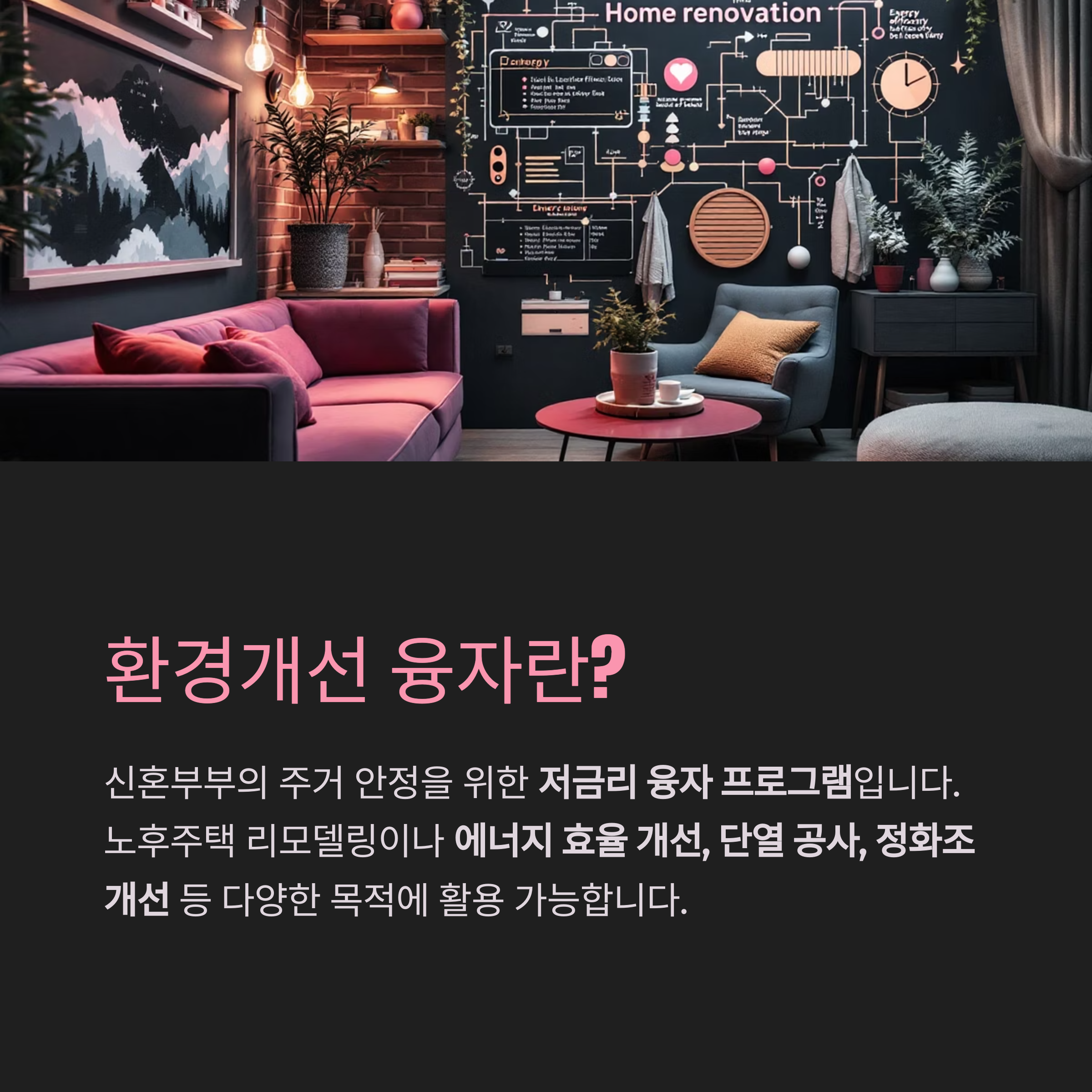 에너지 효율 개선, 단열 공사, 정화조 개선 등 다양한 목적에 사용 가능합니다