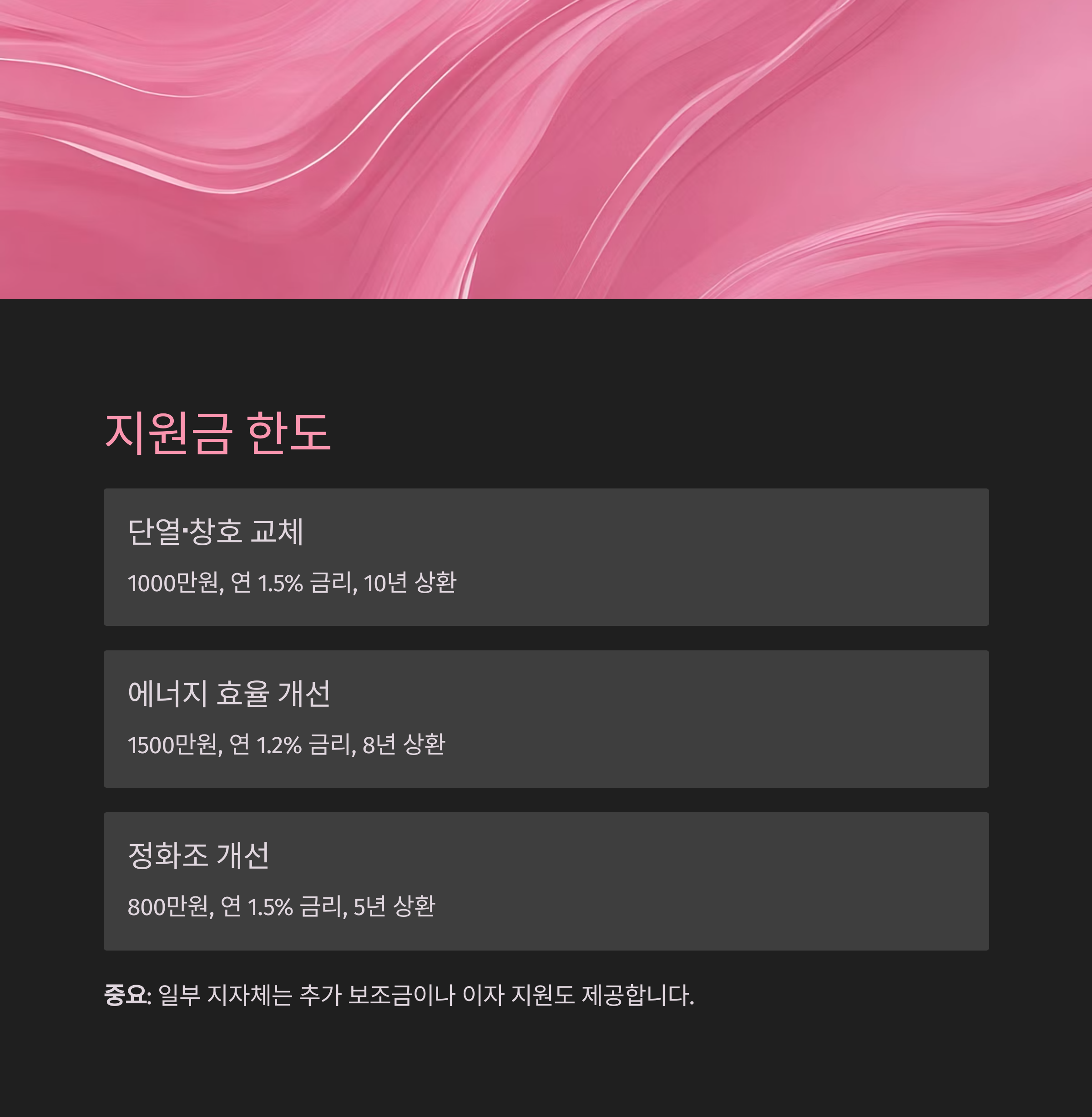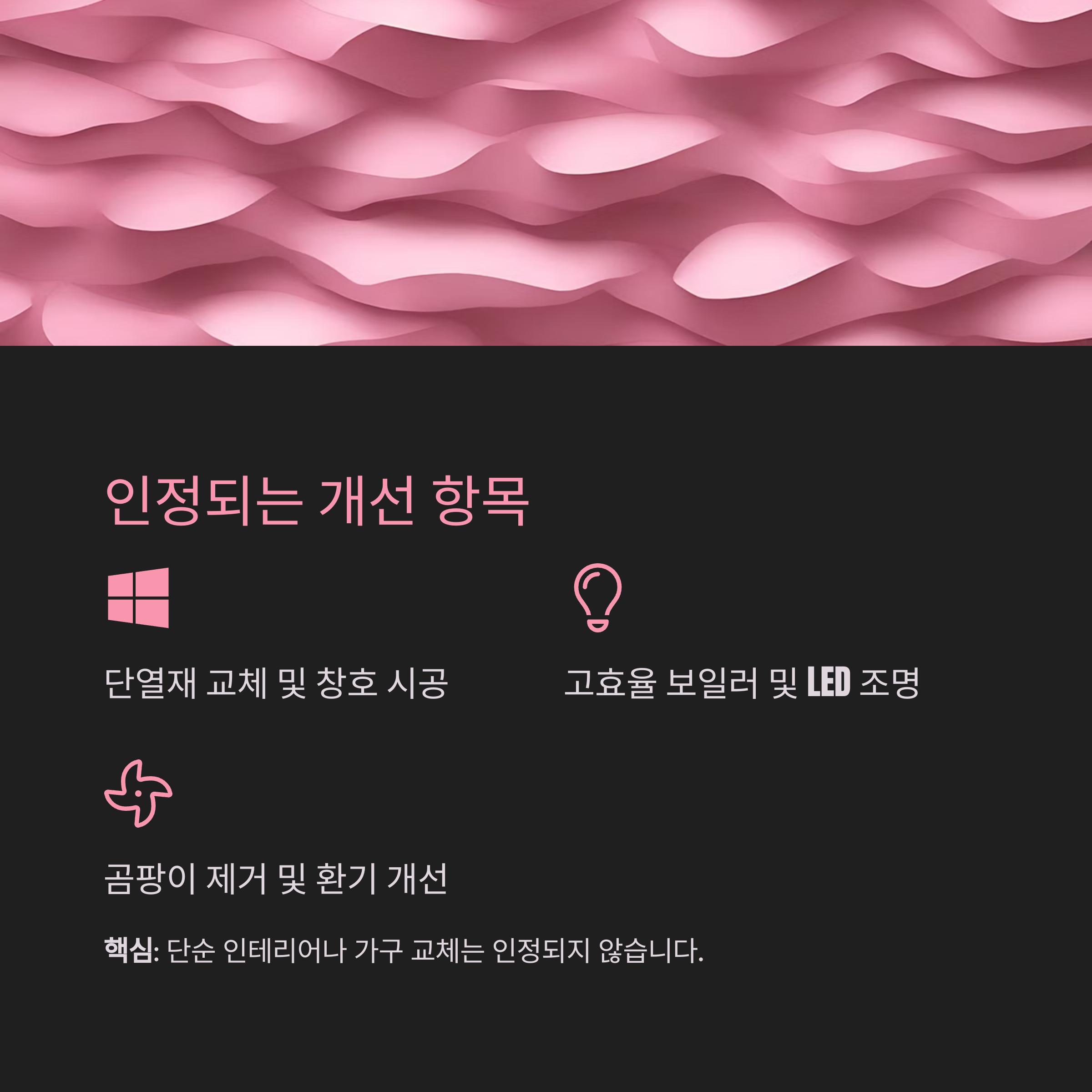에너지 효율 개선, 단열 공사, 정화조 개선 등 다양한 목적에 사용 가능합니다