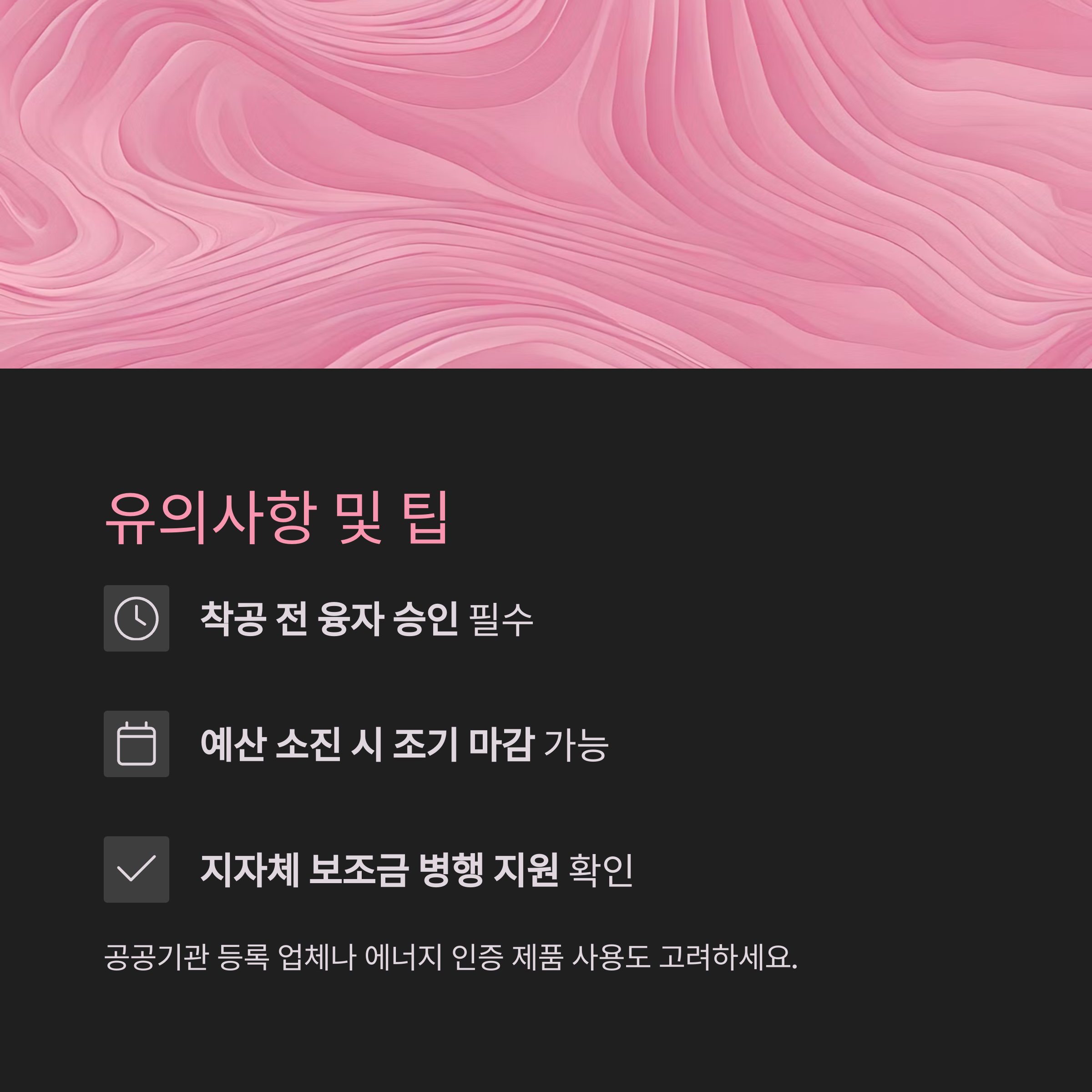 • 리모델링 업체 선정 시, 공공기관 등록 업체 또는 에너지 인증 제품 사용 여부도 고려하세요