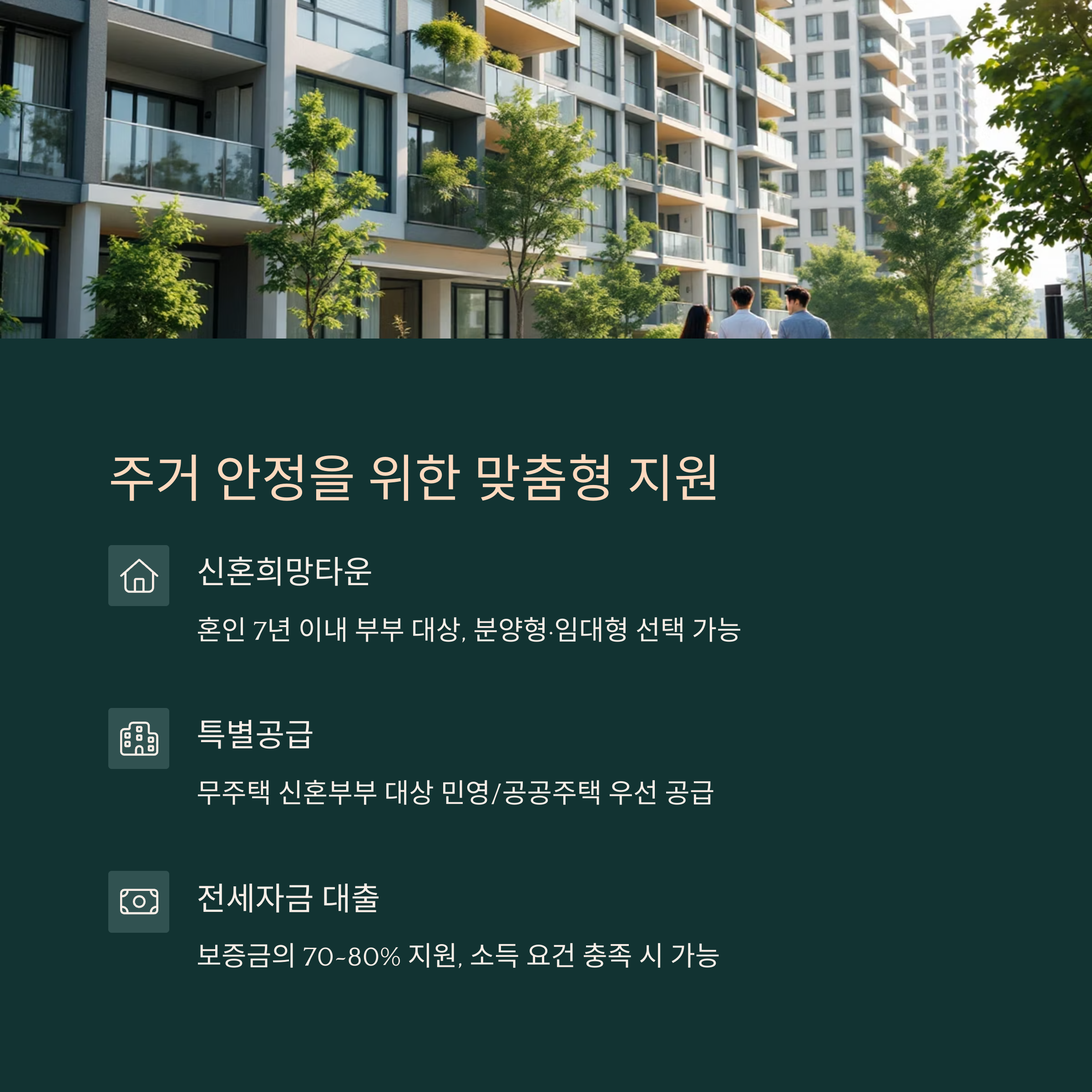 신혼희망타운, 공공임대주택, 전세자금 대출 등 다양한 옵션이 마련되어 있습니다