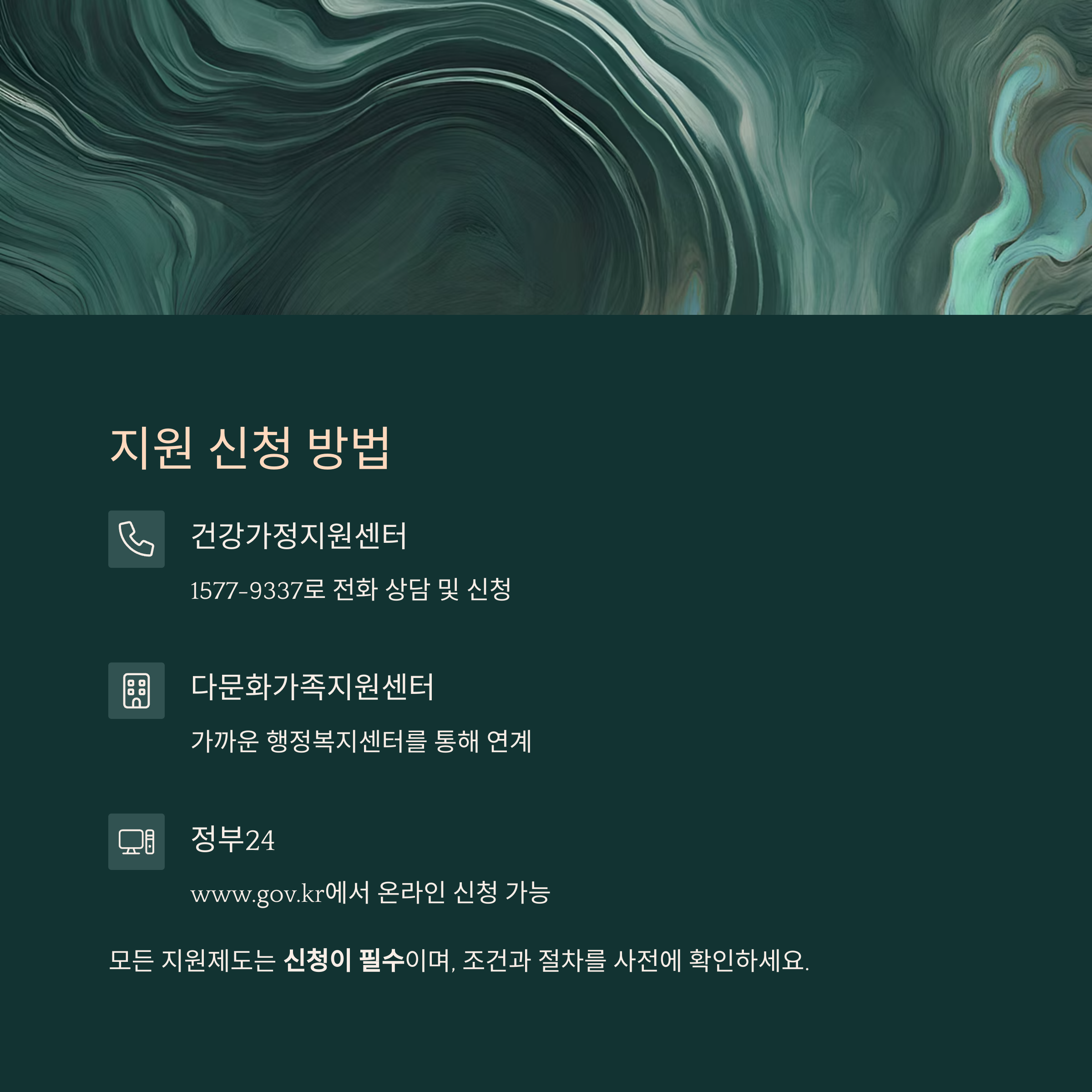 다문화가정의 경우, 출산통역 지원다국어 양육정보 제공이 추가로 이루어집니다