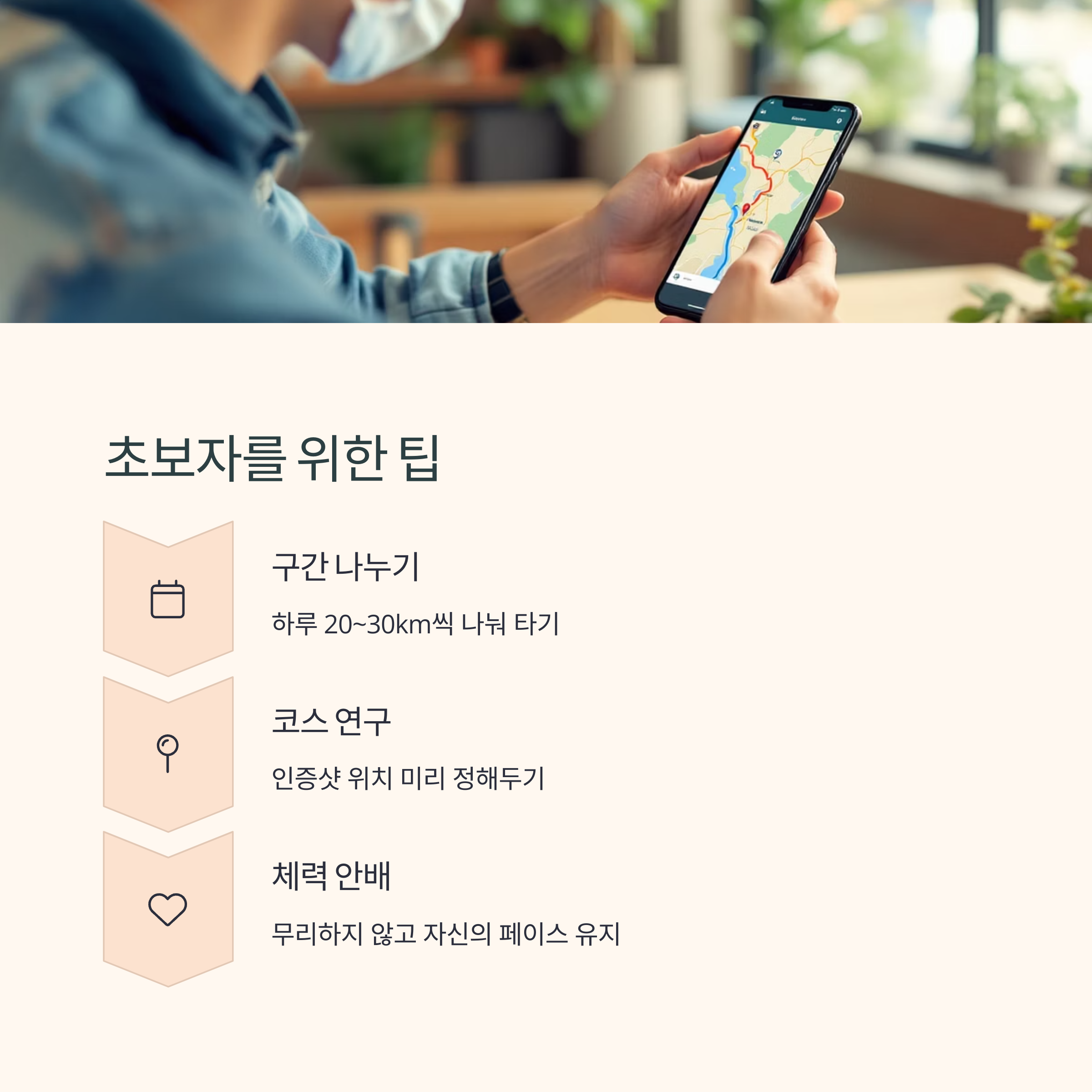 "하루 20~30km씩 나눠 타는 것이 체력 분산에 효과적"입니다