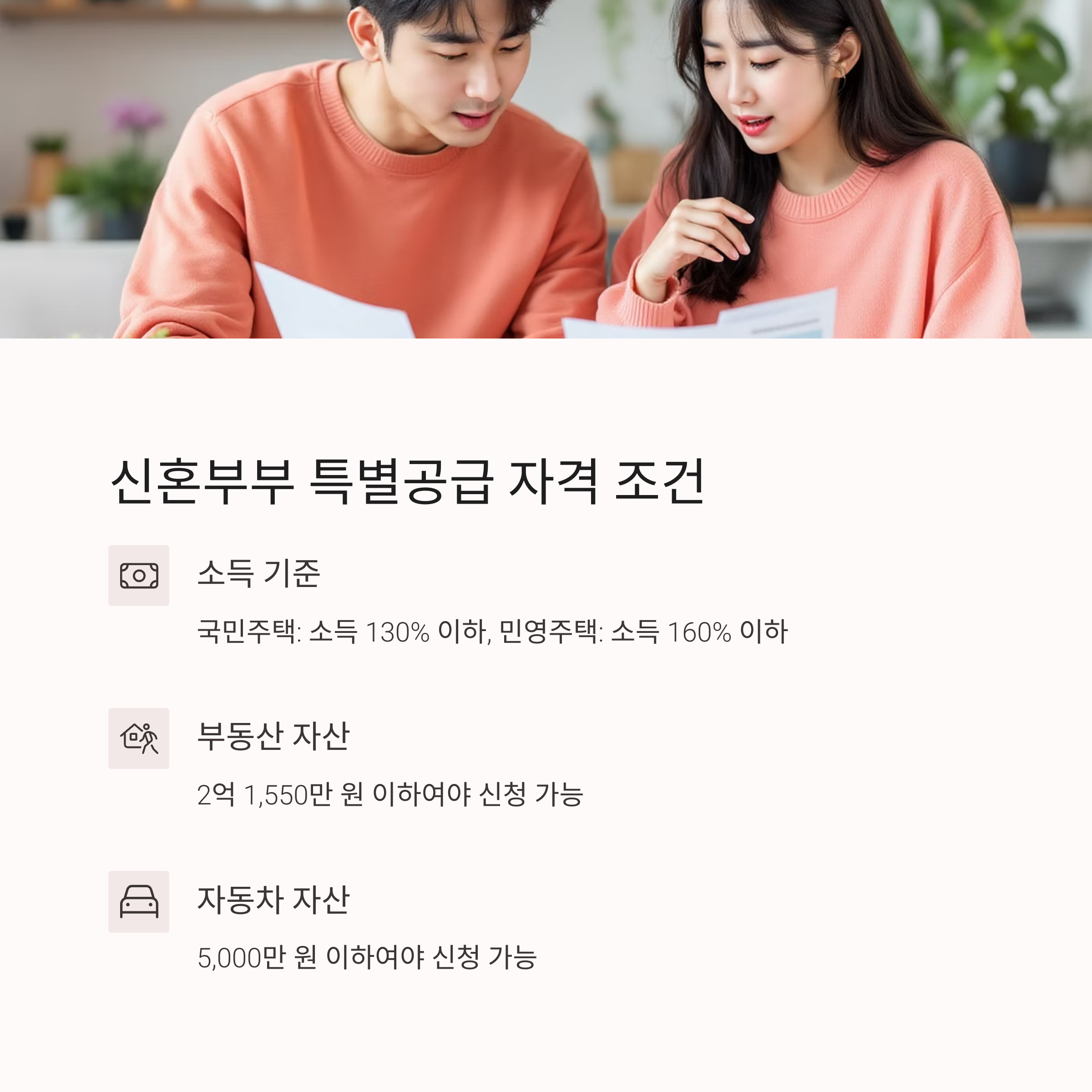 신혼부부 특별공급은 기본적으로 소득과 자산 기준이 적용됩니다.