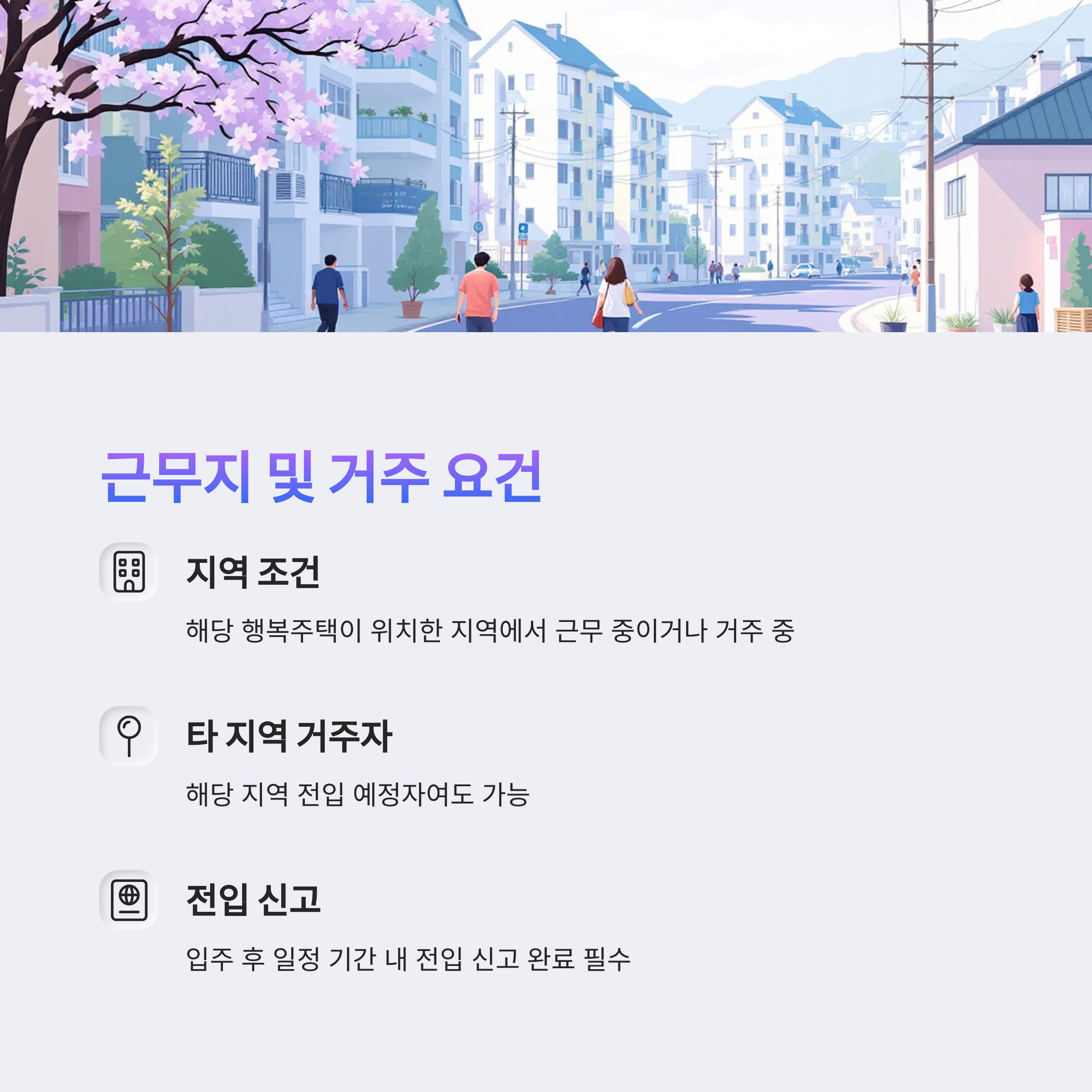 - 해당 행복주택이 위치한 지역에서 근무 중이거나 거주 중이어야 합니다
