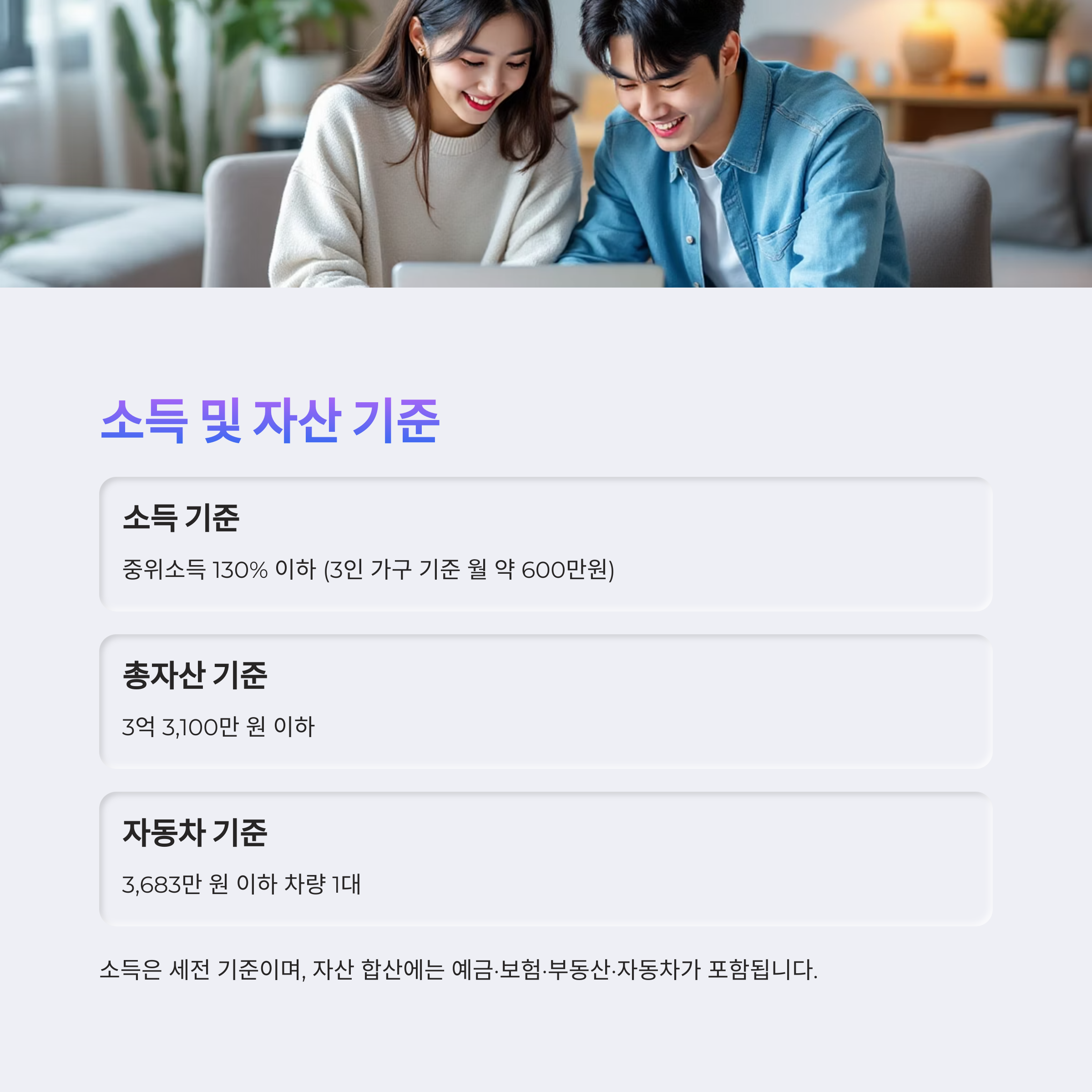 | 자산 기준 | 총자산 3억 3,100만 원 이하, 차량 3,683만 원 이하 |