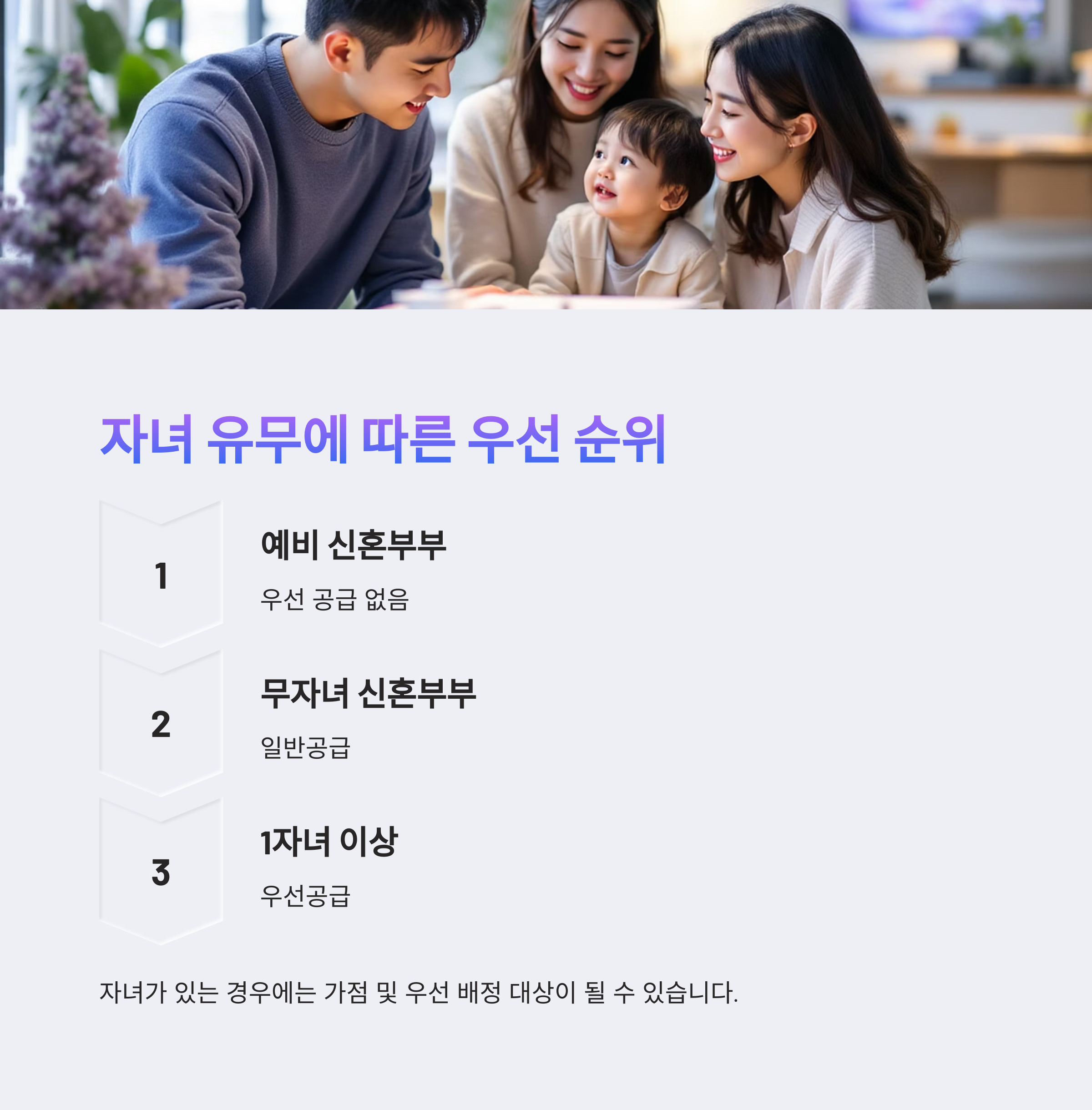예를 들어, 1자녀 이상 가구에게는 일반 신혼부부보다 우선 공급 가능성이 높습니다.