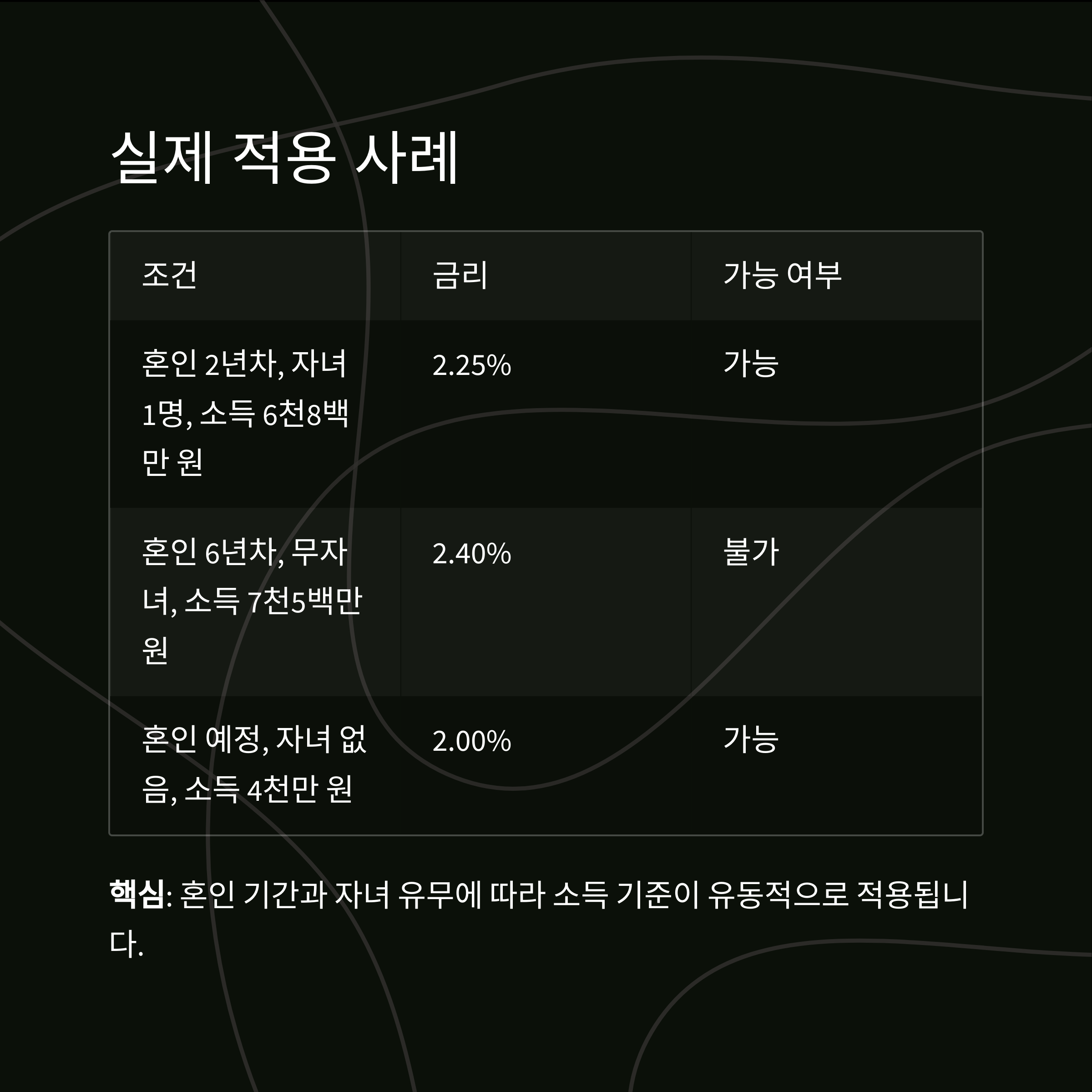 | 혼인 2년차, 자녀 1명, 소득 6천8백만 원 | 2.25% | 가능 |