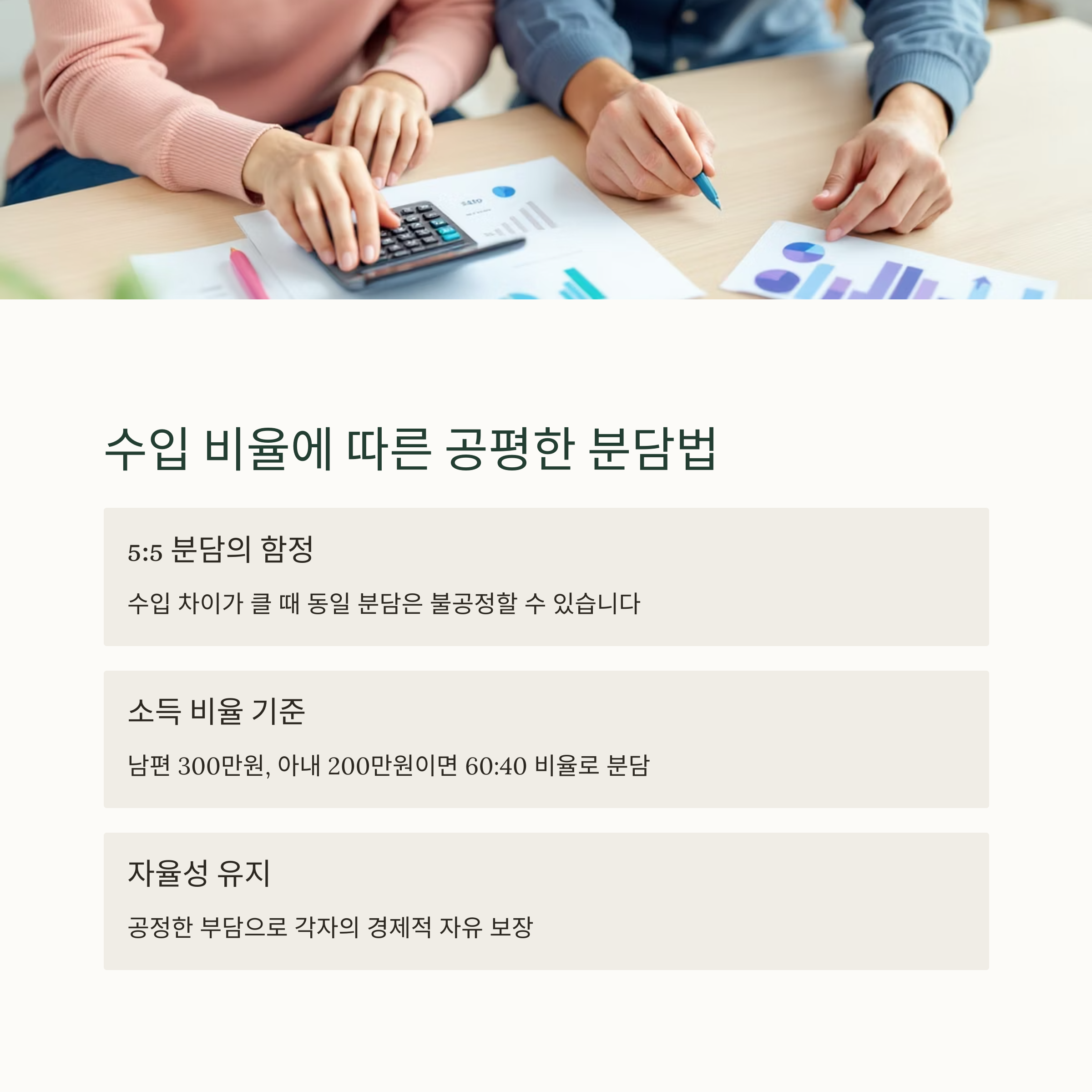 부부 중 한 명의 수입이 월등히 많을 경우, 5:5 분담은 불공정할 수 있습니다