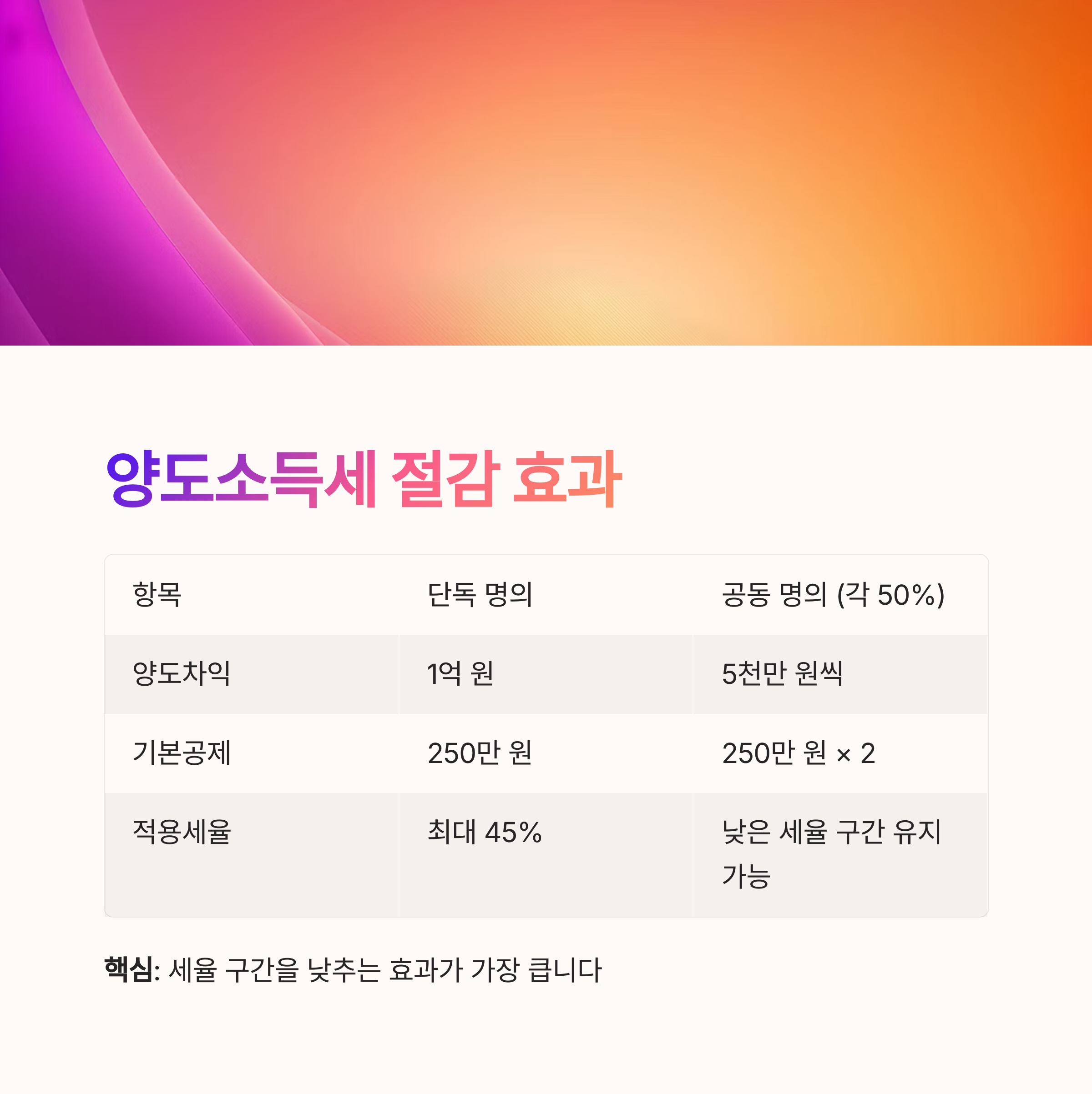 예를 들어, 단독 명의였다면 1억 원의 양도차익에 대해 전액 과세되지만