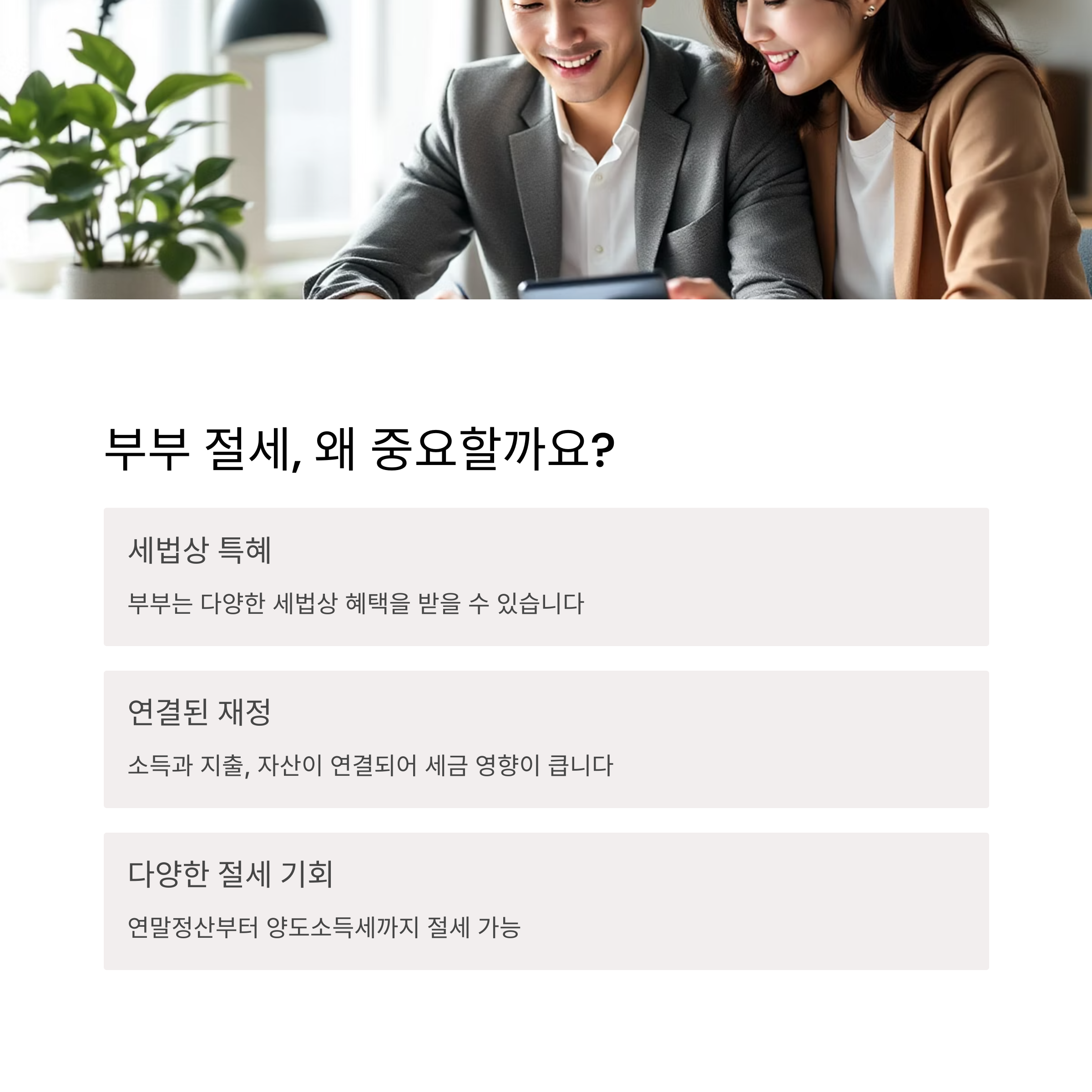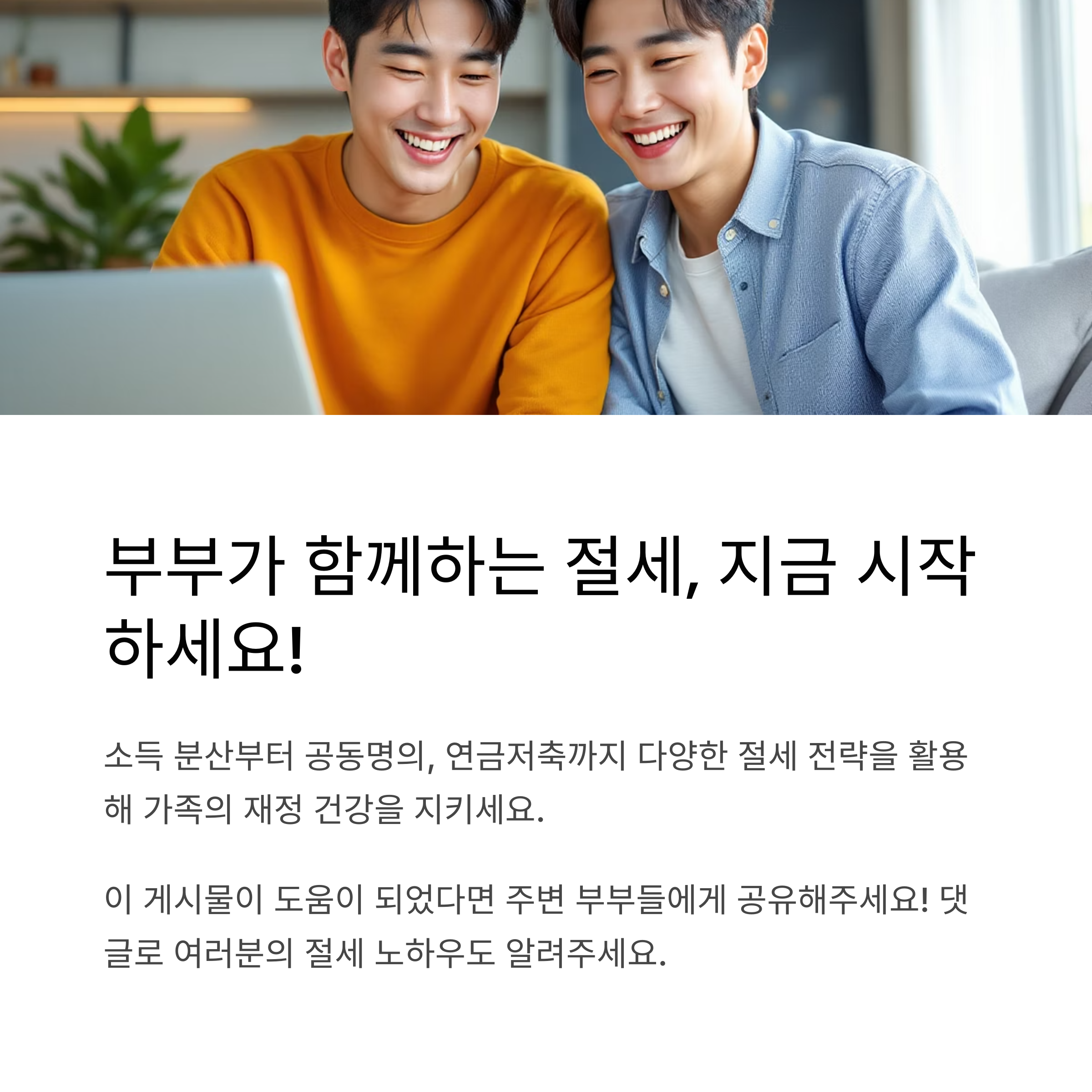 절세는 타이밍과 정보가 핵심입니다. 부부가 함께 준비하면 효과는 두 배가 됩니다.