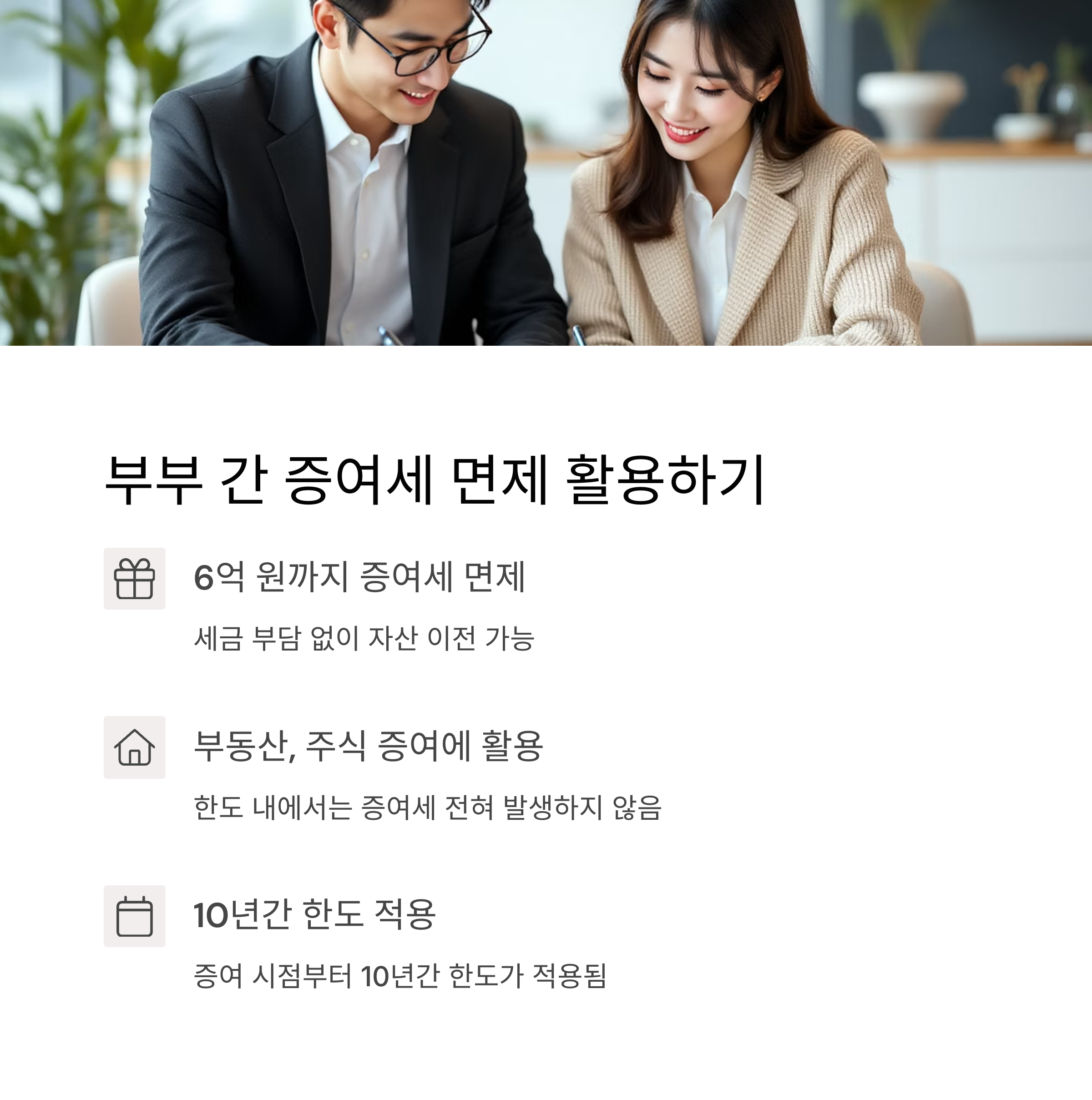 부부 간 증여는 6억 원까지 증여세가 면제됩니다.