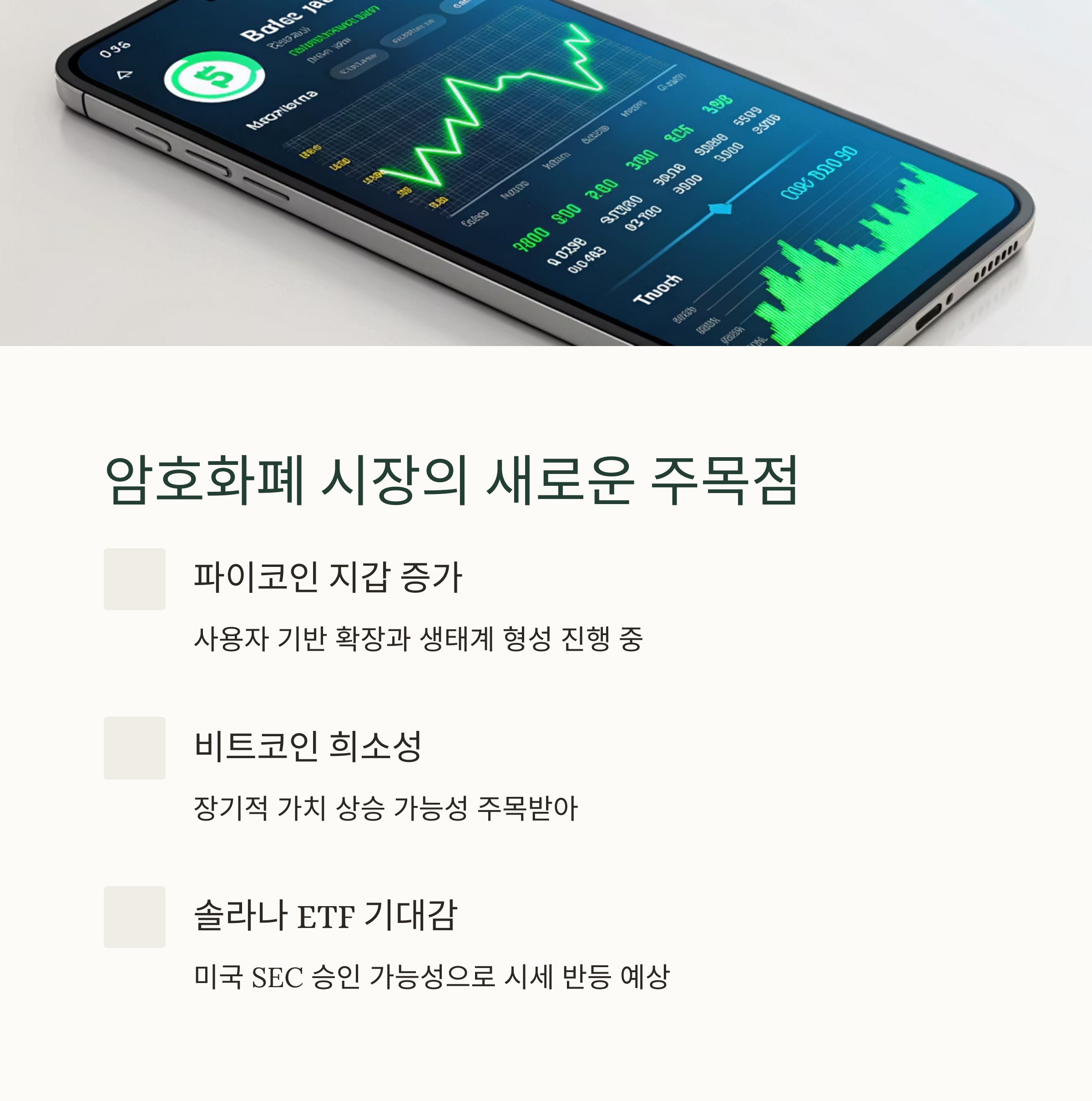 지속적인 지갑 증가세와 함께 파이코인은 독립적인 생태계를 구축 중이며, 주요 암호화폐인 비트코인과 솔라나의 시장 흐름 또한 주목받고 있습니다. 특히 ETF 승인 여부, 락업 해제, 투자 심리에 따라 시장의 큰 변동성이 예고되고 있습니다.