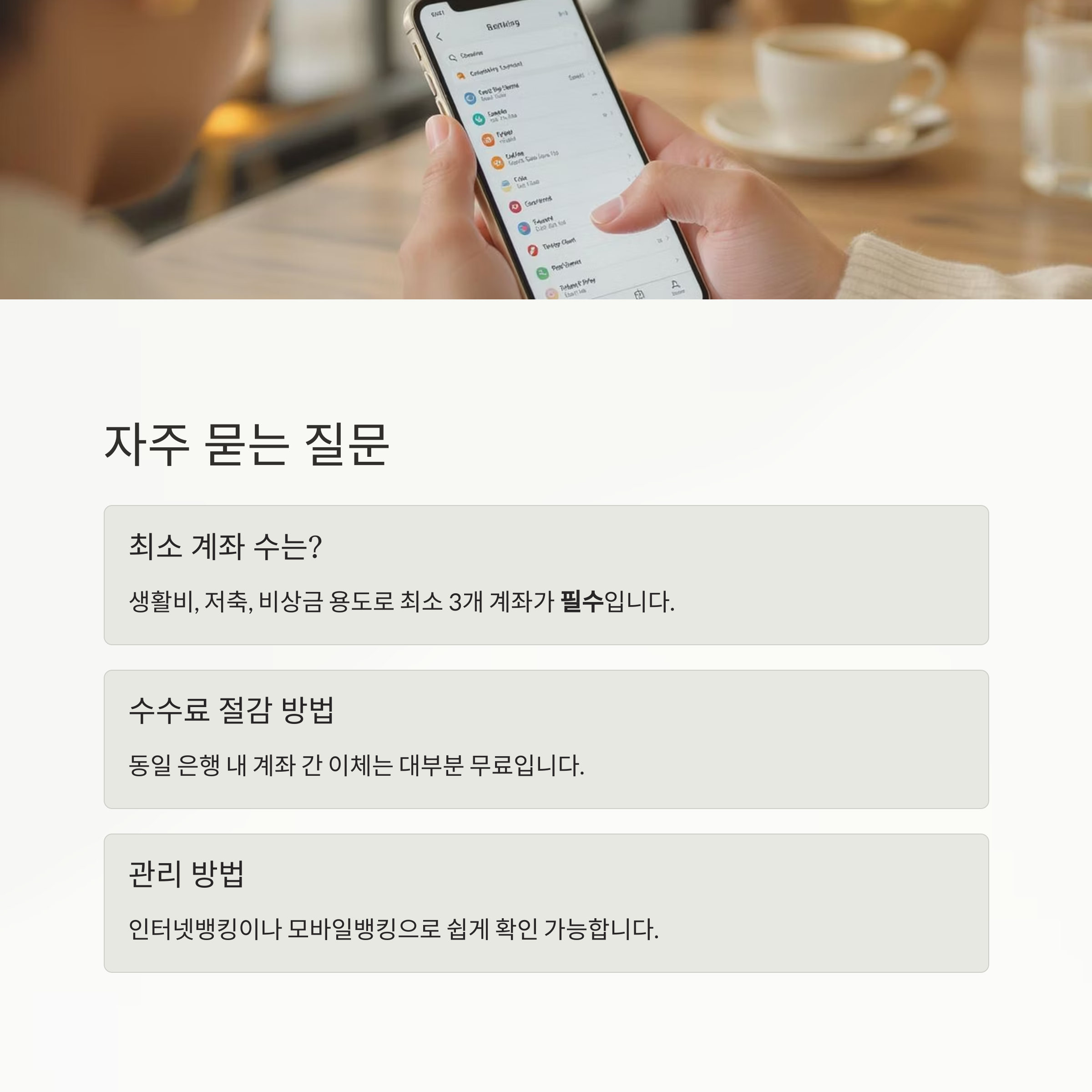 보통 3개 계좌를 권장합니다. 생활비·저축·비상금 용도로 구분하는 것이 필수입니다.