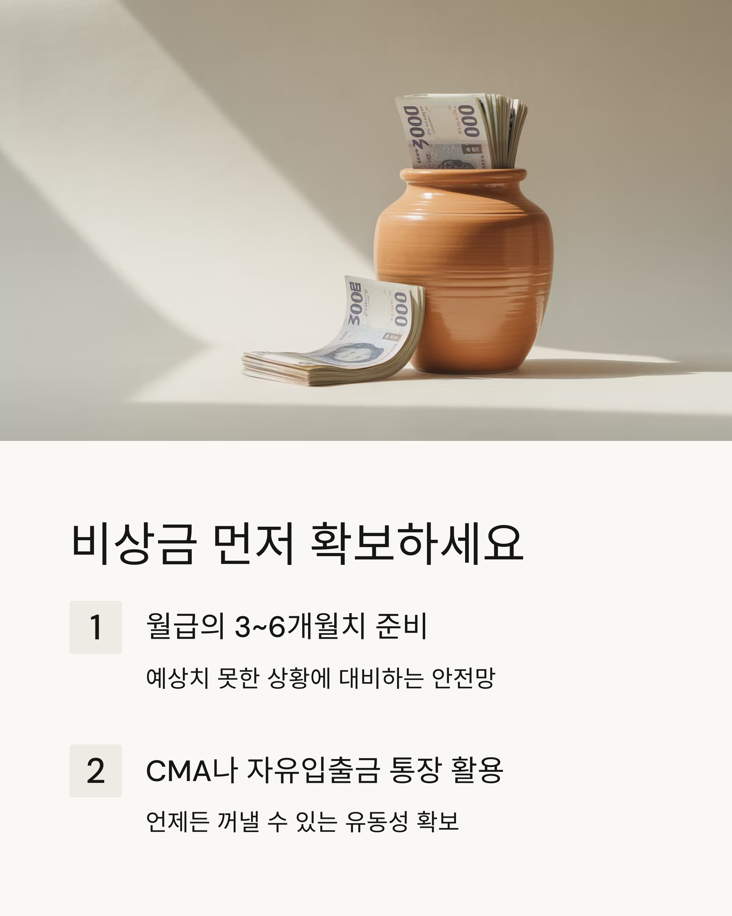 - 월급의 3~6개월치 정도를 비상금으로 준비해두세요.