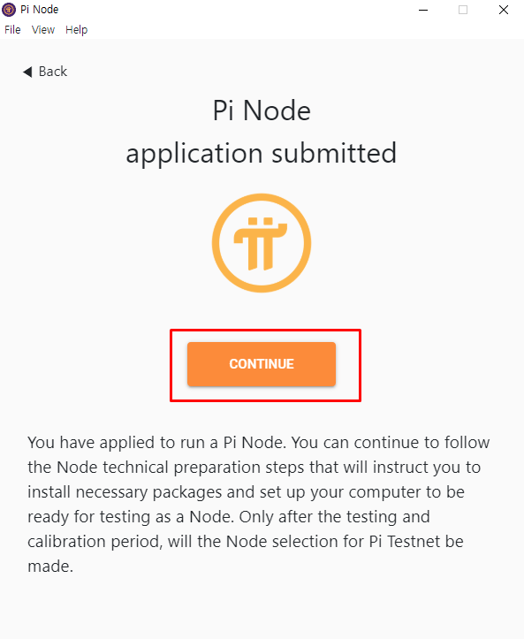 다시 PC로 돌아와 PI NODE 프로그램에서 Node를 클릭한 후 CONTINUE를 눌러줍니다.