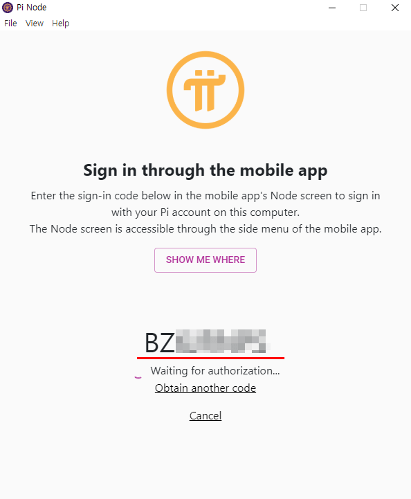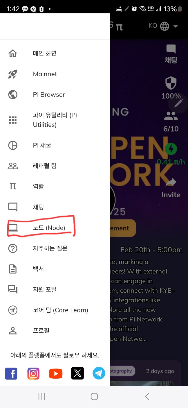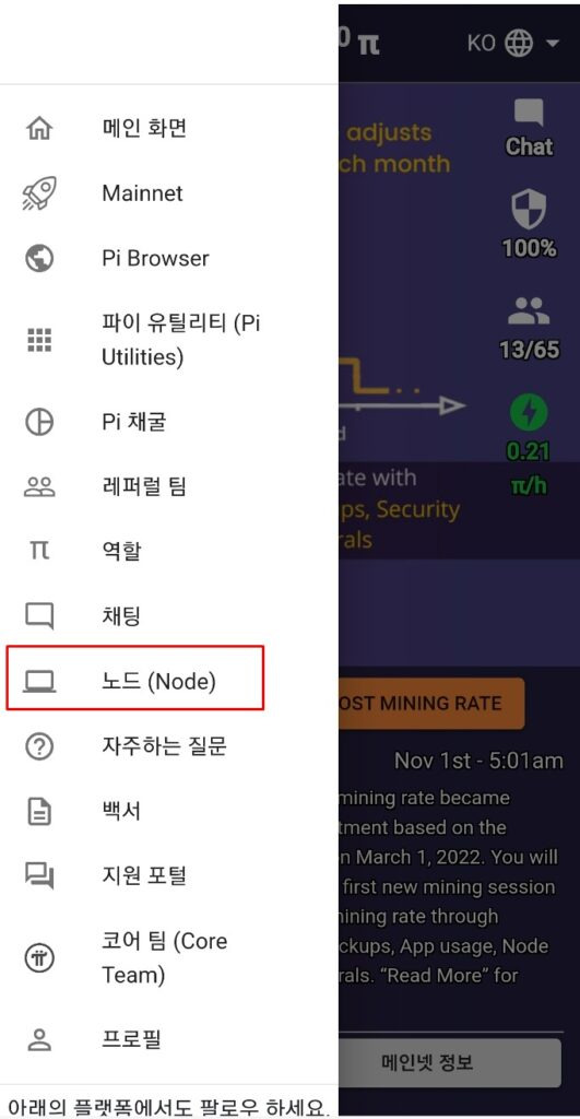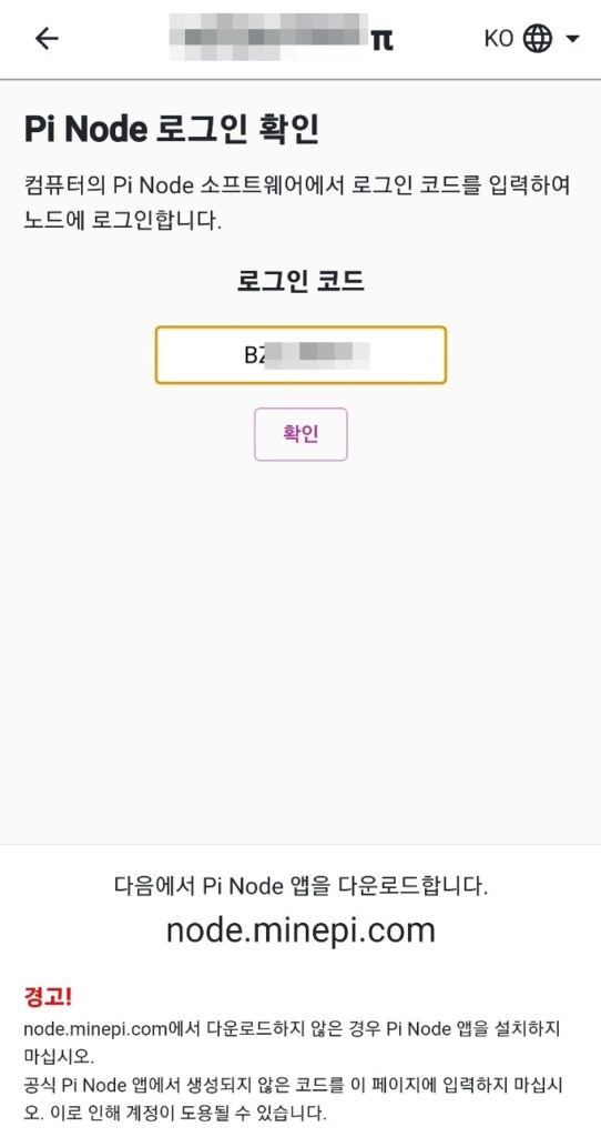 이제 휴대폰의 Pi 앱으로 접속하여 삼선 누르고 – 노드(Node)로 들어갑니다. 아까 PC에서 보았던 로그인 코드를 입력하고 확인을 눌러줍니다.