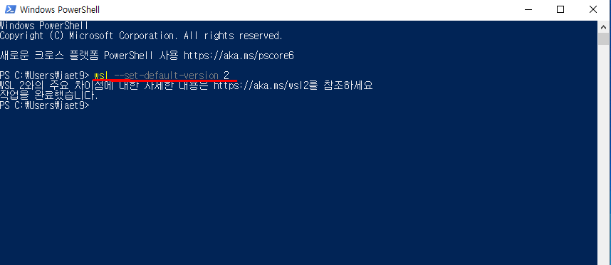 PC 재부팅 완료 후 다시 Windows Power Shell을 실행하여 세 번째 명령어를 실행해줍니다.
