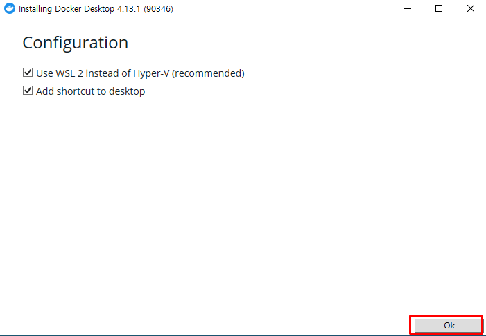 다운로드 받은 도커 설치 파일을 실행하여 설치를 진행합니다. 설치가 완료 되었다면 Docker를 실행해주세요.