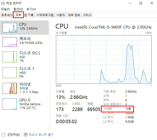 [성능] 탭 우측 하단의 가상화가 ‘사용’으로 되어있어야 노드 돌릴수 있는 컴입니다.