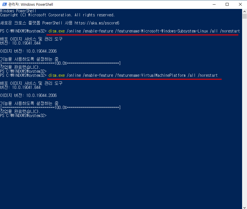 - 2차 명령어 dism.exe /online /enable-feature /featurename:VirtualMachinePlatform /all /norestart