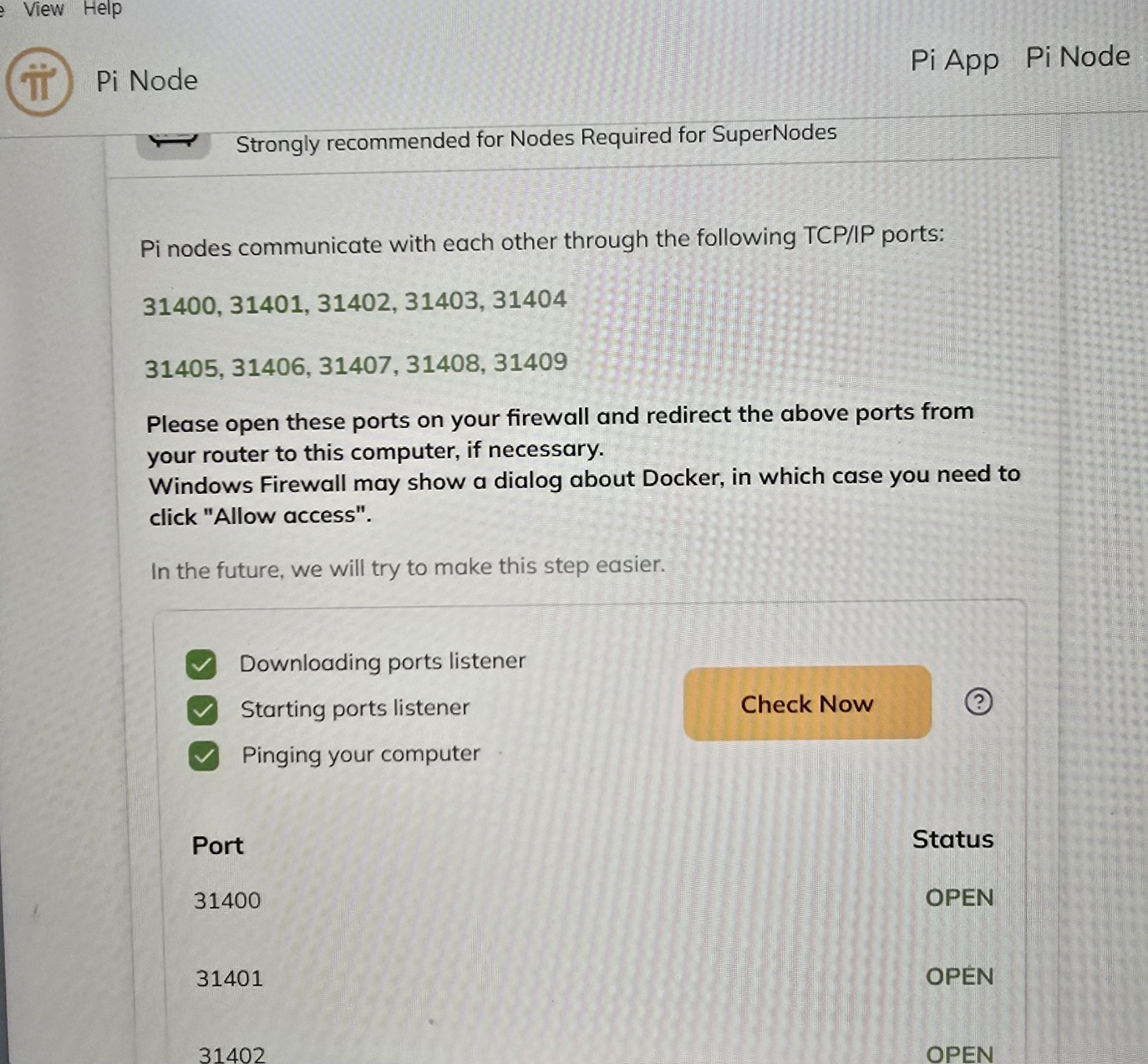 이제 다시 Pi Node로 돌아와 ‘Open router ports’를 누르고 Check now 버튼을 누릅니다. Check now 버튼을 한 번 누르면 액세스 허용 창이 나타나는데 이 때 허용을 눌러주신 뒤 Check now 버튼을 한 번 더 눌러주시기 바랍니다.