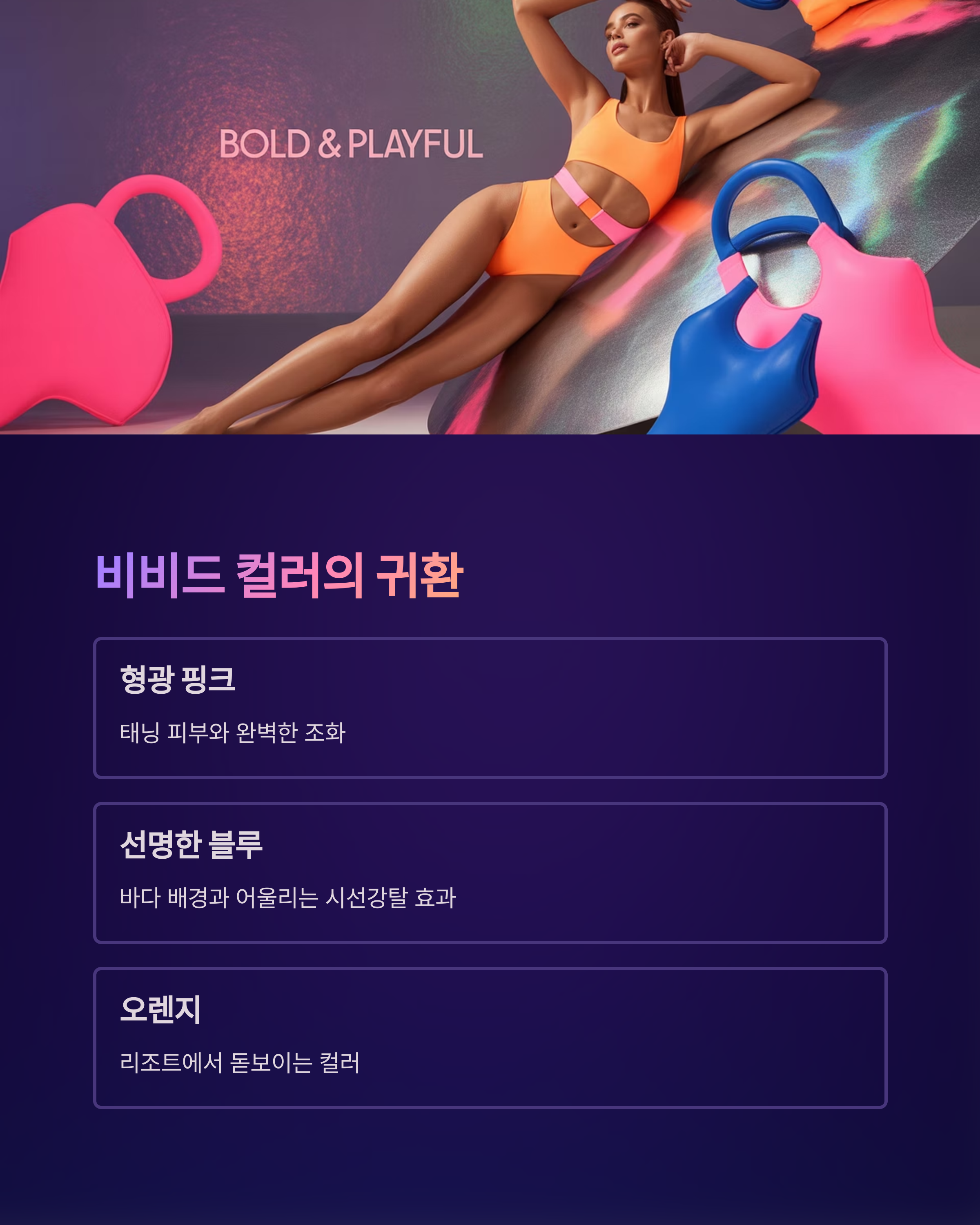 올여름 수영복 트렌드는 단연 비비드 컬러입니다. 형광 핑크, 오렌지,