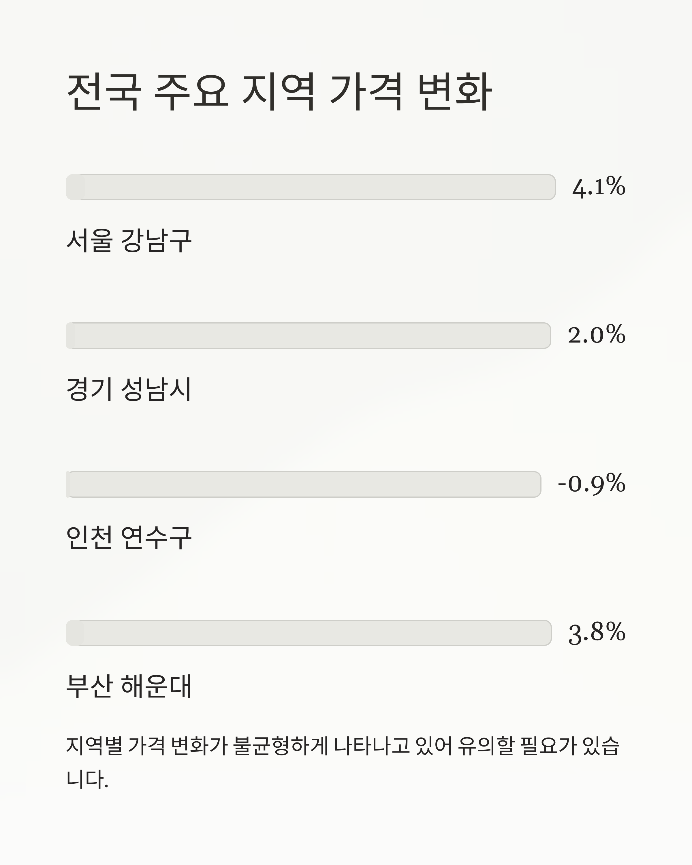 반면 수도권 외곽 지역은 여전히 약보합세를 보이며, 시장 회복이 지역별로