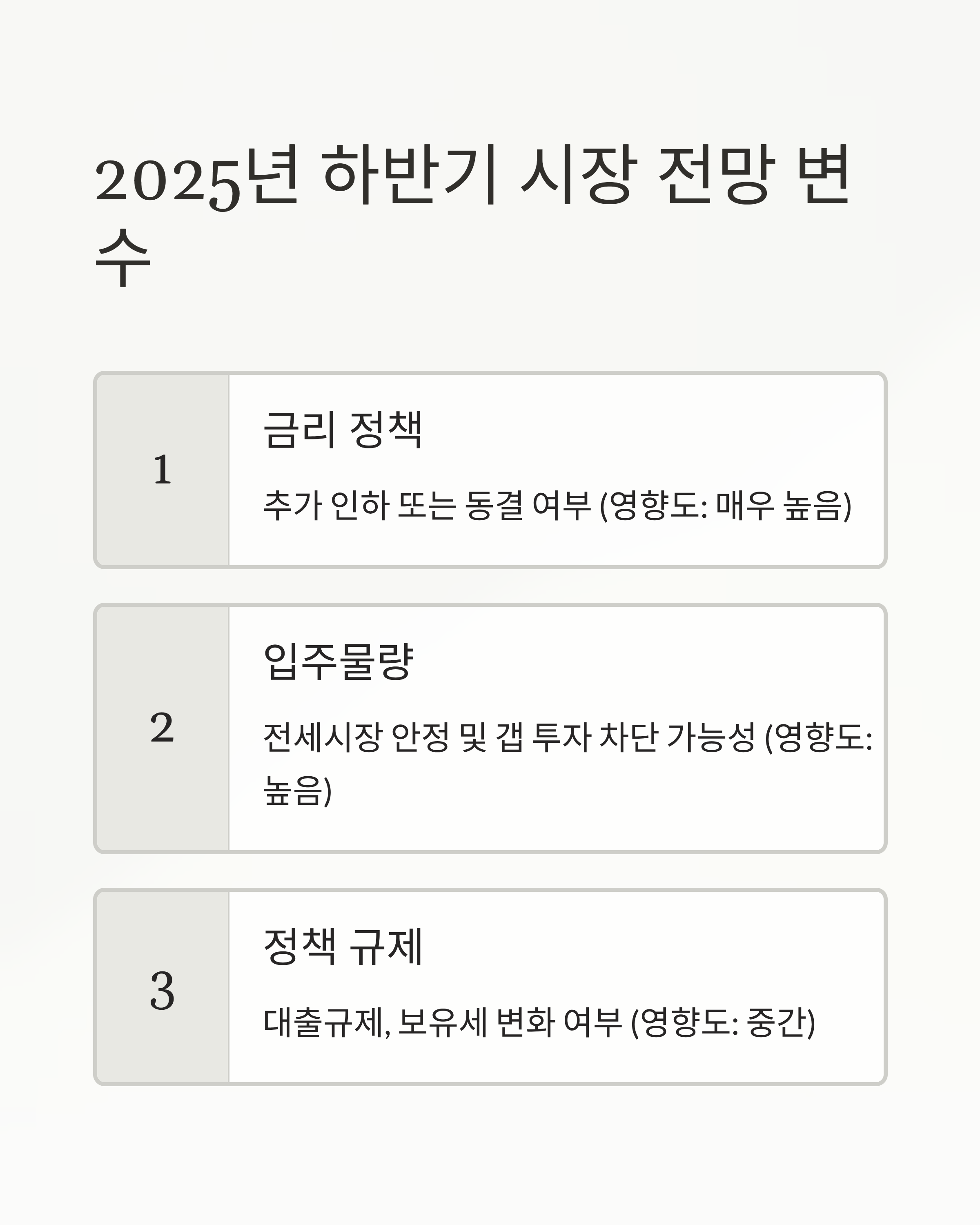 | 정책 규제 | 중간 | 대출규제, 보유세 변화 여부 |