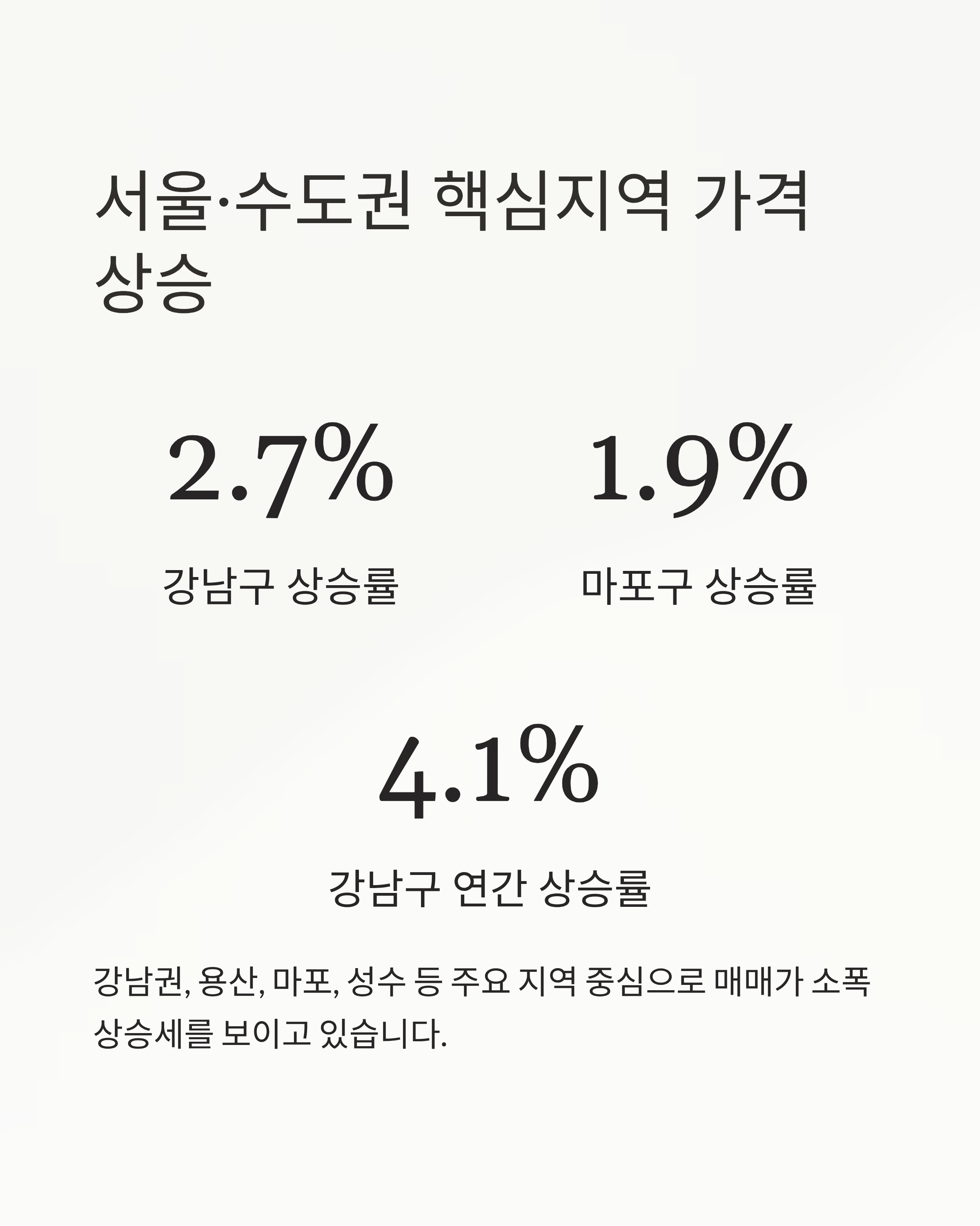 매매가가 소폭 상승세를 보이고 있습니다. 특히 강남구는 작년 대비 2.7% 상승,