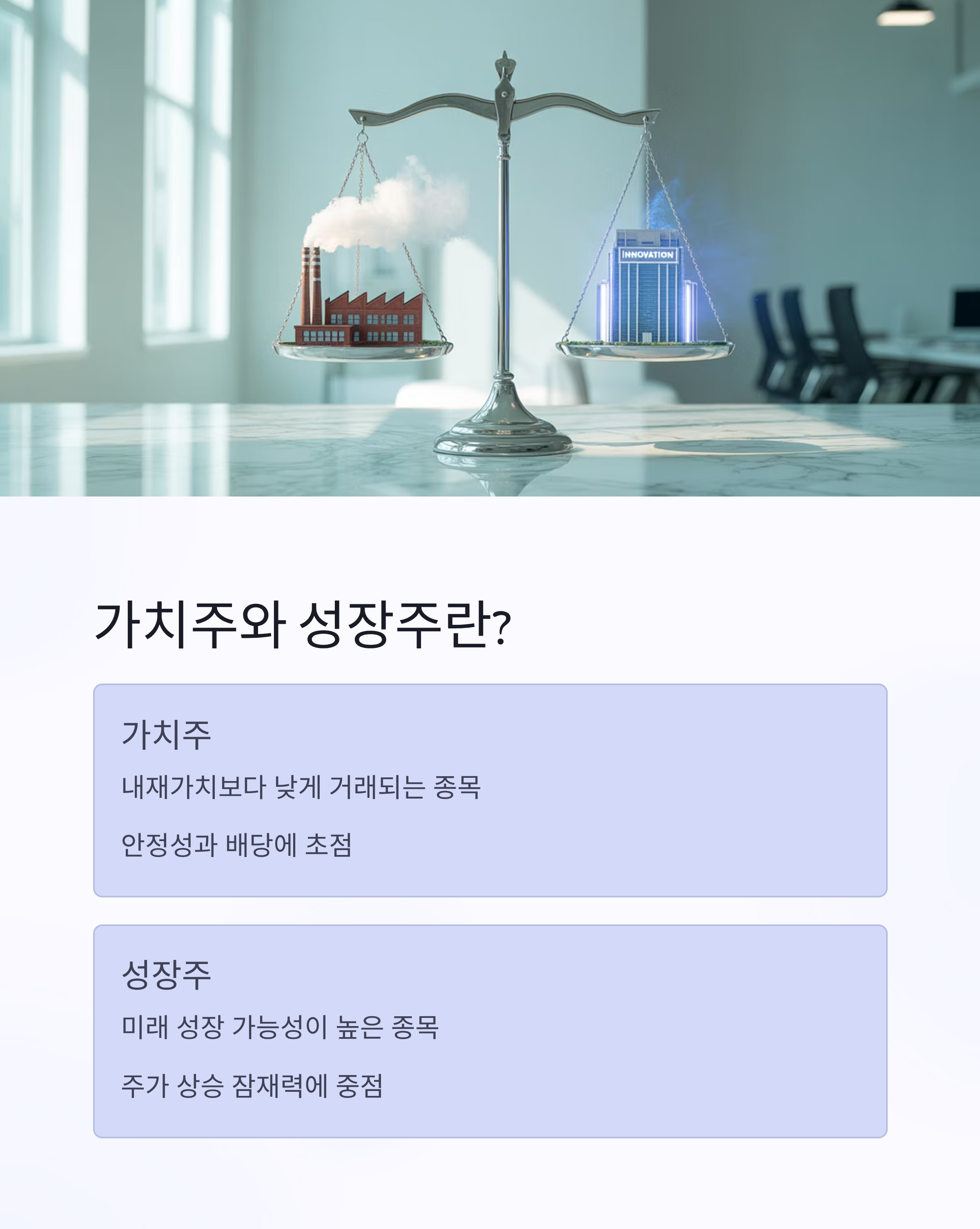 가치주는 안정성과 배당에 초점을 맞추고, 성장주는 미래 성장성과