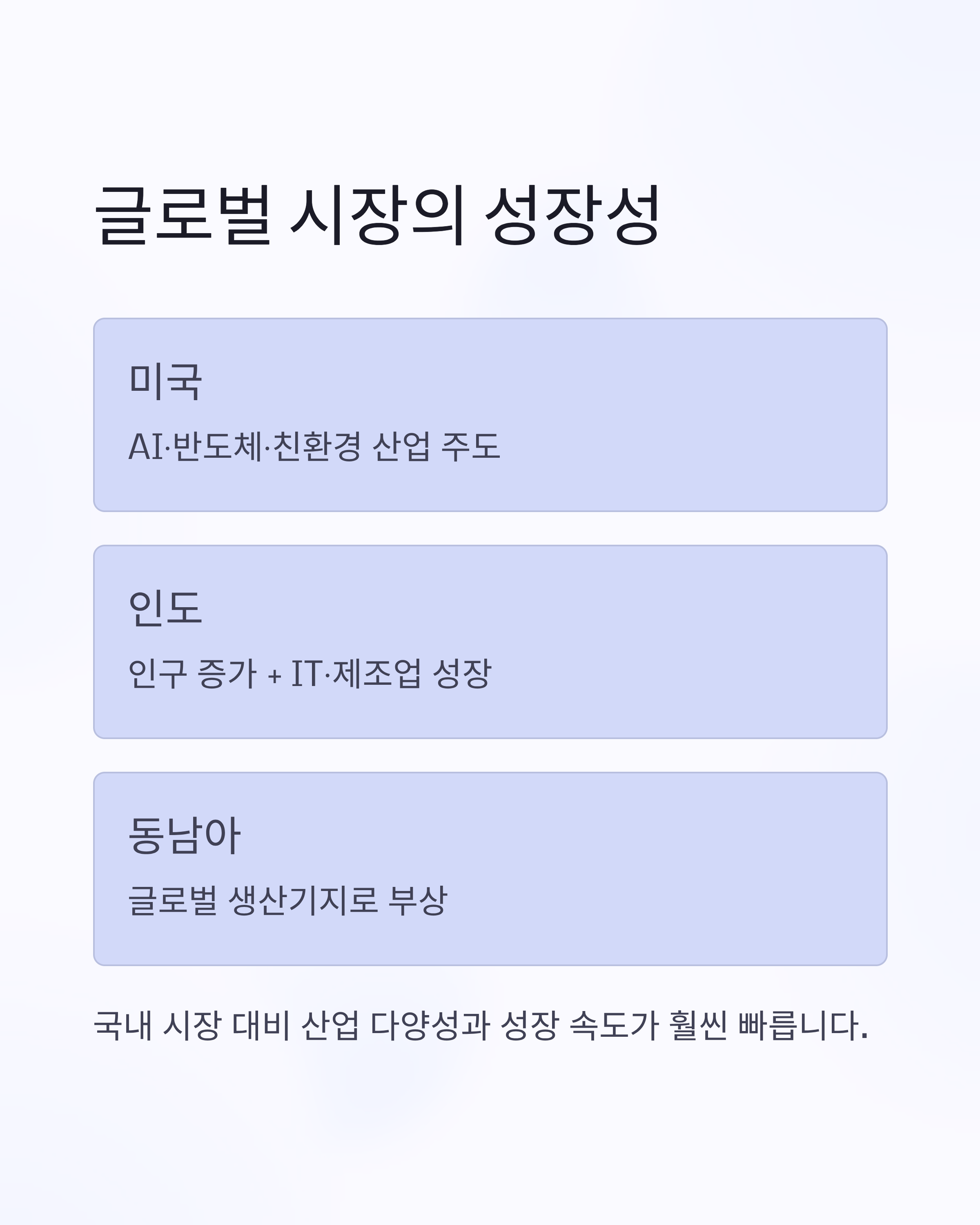 📈 국내 시장 대비 산업 다양성과 성장 속도가 훨씬 빠릅니다.