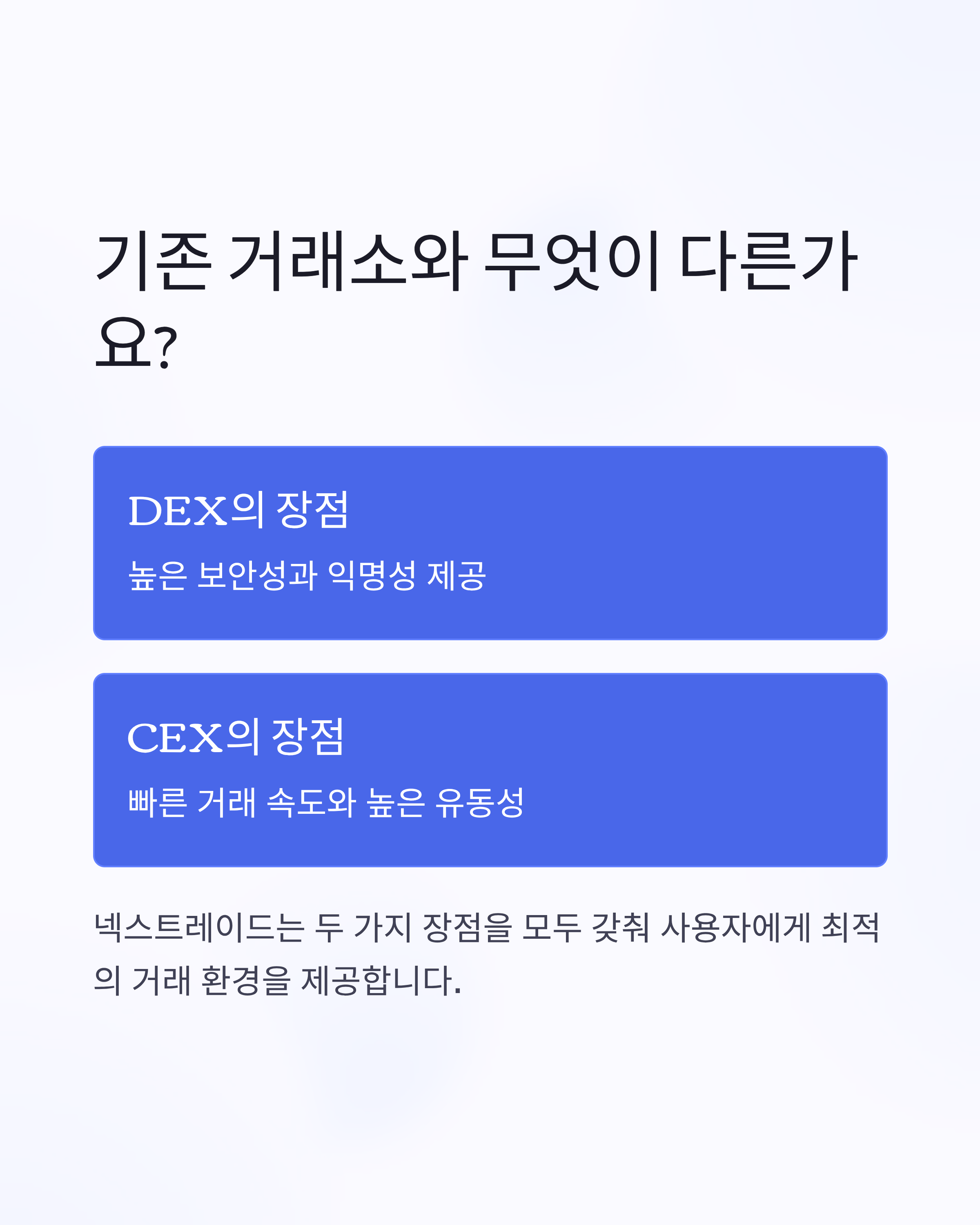 넥스트레이드는 중앙화 거래소(CEX)와 탈중앙화 거래소(DEX)의 장점을 결합한 하이브리드형 대체 암호화폐 거래 플랫폼으로, 기존 거래소의 문제점을 해결하고자 등장했습니다. 사용자의 자산을 직접 관리할 수 있으면서도 빠르고 안정적인 거래 환경을 제공한다는 점에서 투자자들의 관심을 받고 있습니다. 본문에서는 넥스트레이드의 정의, 특징, 구조, 사용 방법, 그리고 장단점까지 다각도로 정리해보겠습니다.