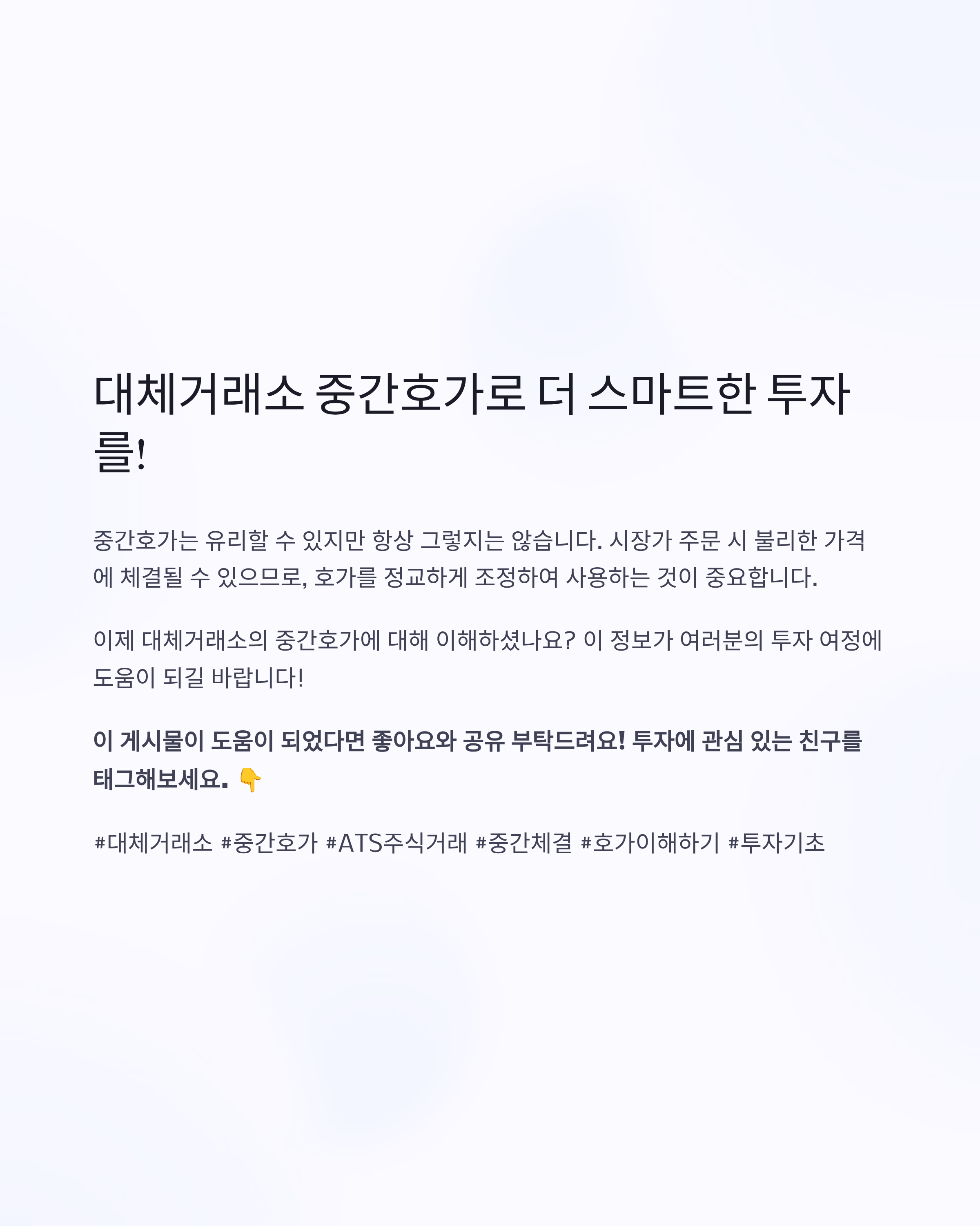 대체거래소(ATS)의 등장으로 주식 거래 환경이 다양해졌습니다. 이와 함께 자주 등장하는 용어 중 하나가 바로 ‘중간호가’입니다. 특히 대체거래소에서는 중간호가가 갖는 의미와 기능이 다르기 때문에, 제대로 이해해야 효율적인 투자 전략을 세울 수 있습니다. 본 글에서는 대체거래소의 중간호가가 무엇인지, 어떤 역할을 하며 어떤 영향이 있는지를 상세히 다뤄보겠습니다.
