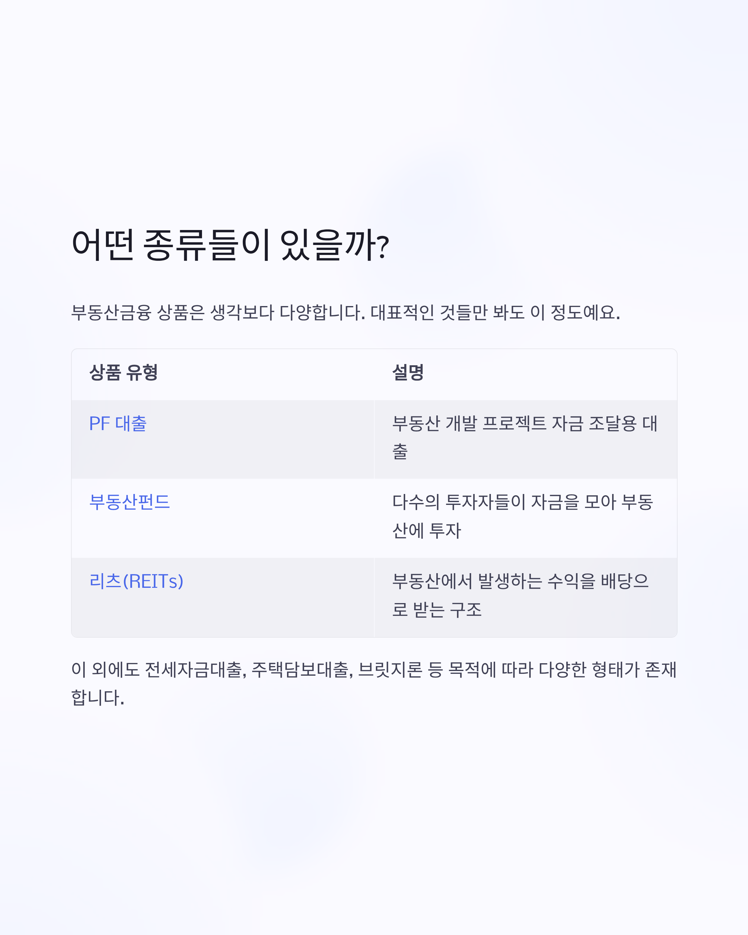 부동산금융 상품은 생각보다 다양합니다. 대표적인 것들만 봐도 이 정도예요.