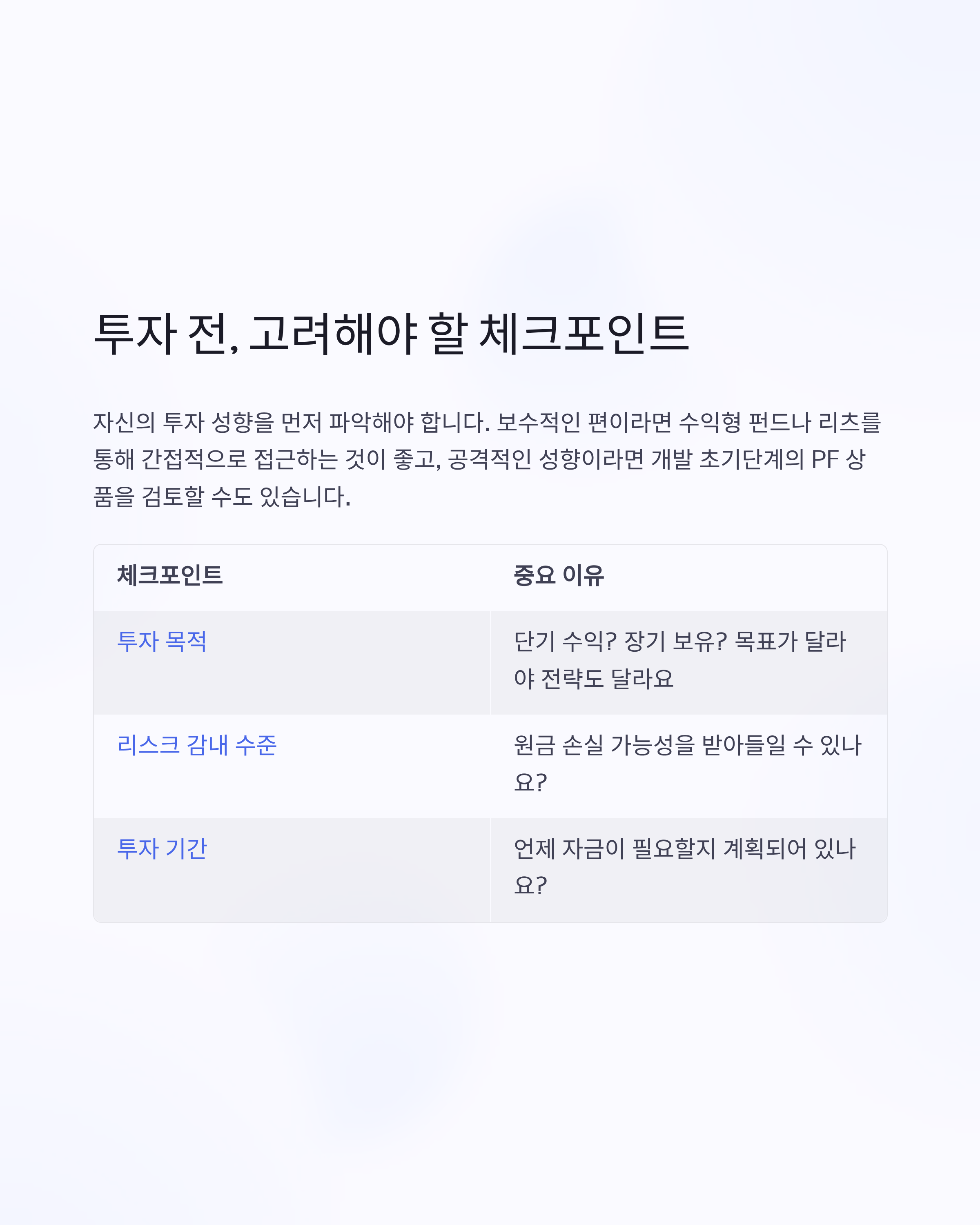 | 투자 목적 | 단기 수익? 장기 보유? 목표가 달라야 전략도 달라요 |