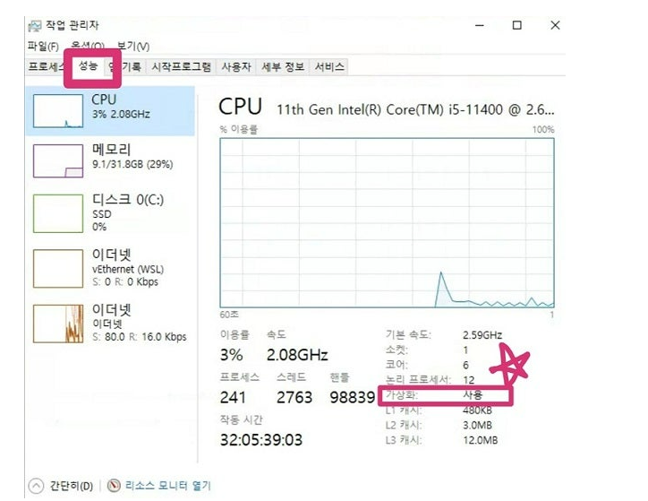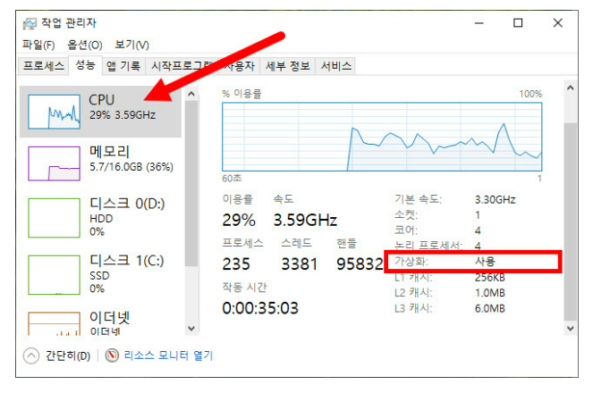 가상화가 사용으로 변한 것을 볼수 있습니다