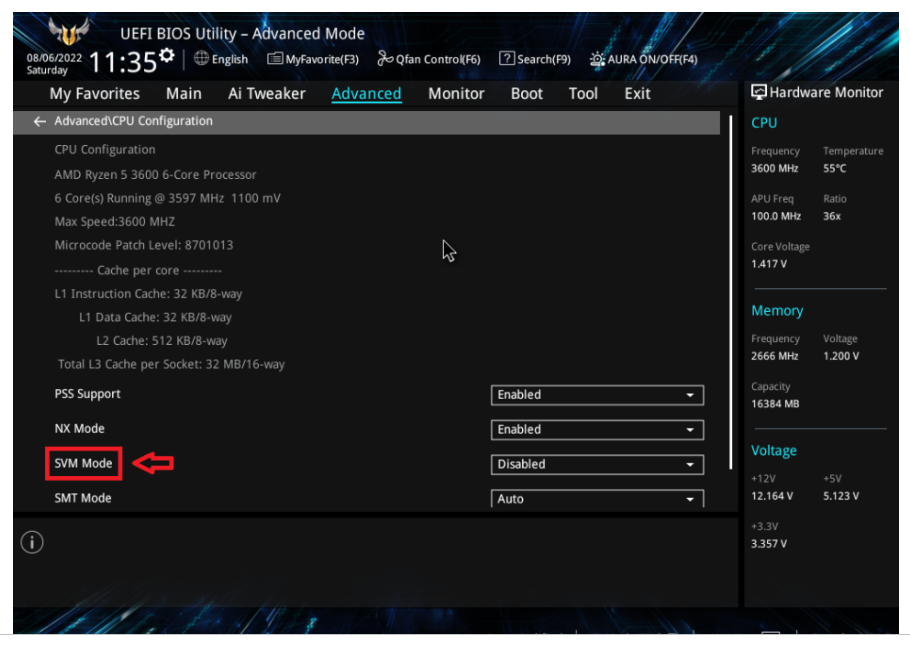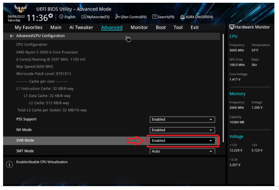 SVM Mode 우측 Disabied 를 Enaibied 로 바궈 주세요