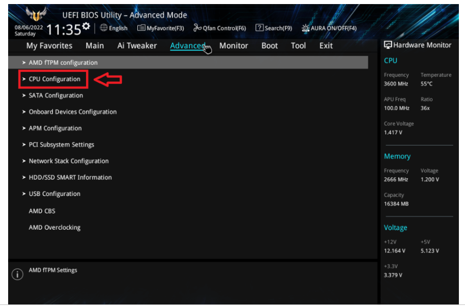 좌측 상단 CPU configuration 으로 들어 갑니다