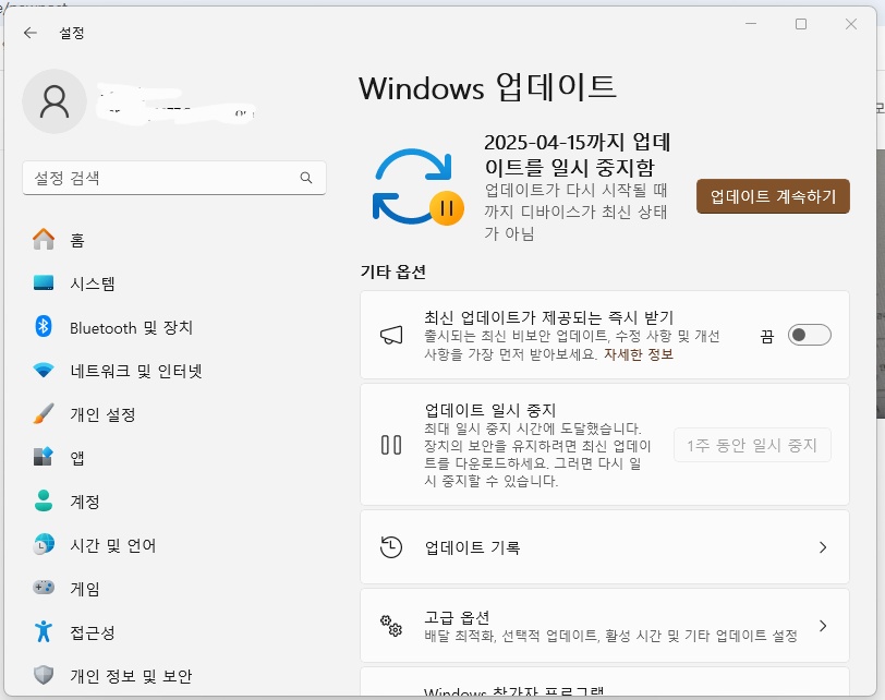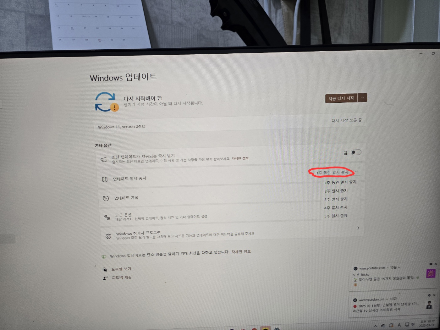 4.업데이트 일시 중지 를 클릭 하시면 1주일 에서 5주일 까지 일시적으로 미룰수 있습니다