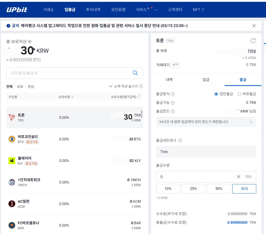My assets(내 자산) 확인하시면 트론이 잘 들어왔어요 코인 30개 에서 0.9는 수수료로 빠져 29.1 개를 받았습니다.