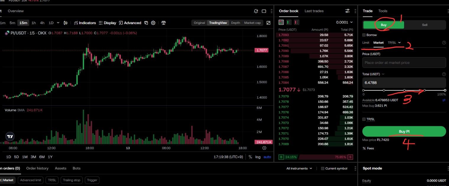 Tride로 들어가시고 Spot에서 원하는 코인 PI 입력,