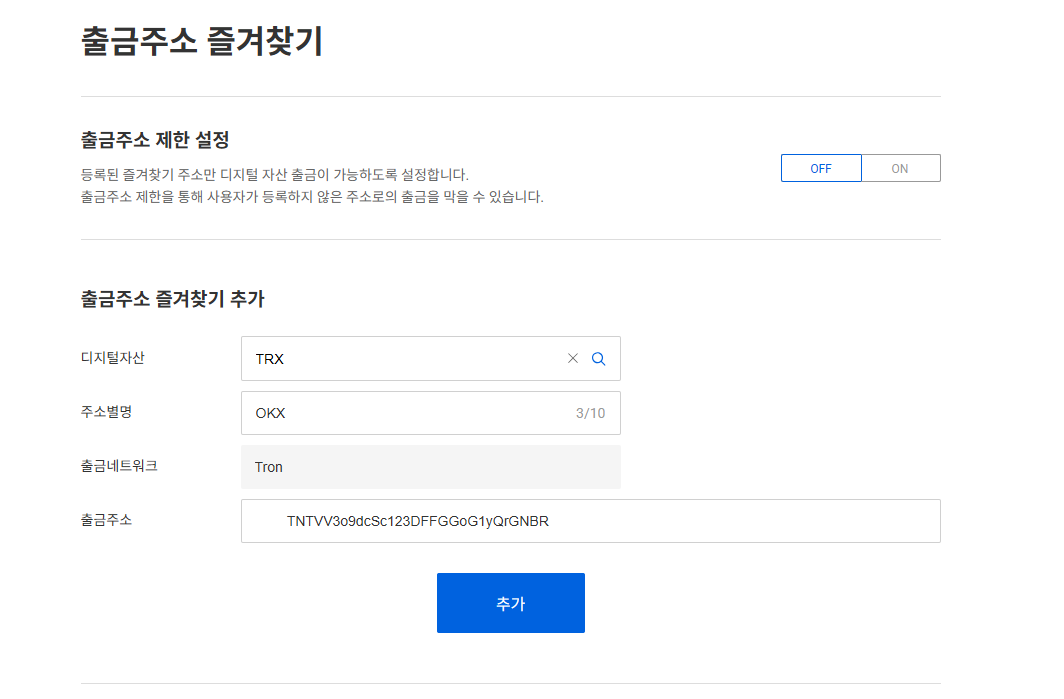마이 페이지에서 출금주소 즐겨찾기 /관리하기 에 등록하시고 사용하셔야 합니다.