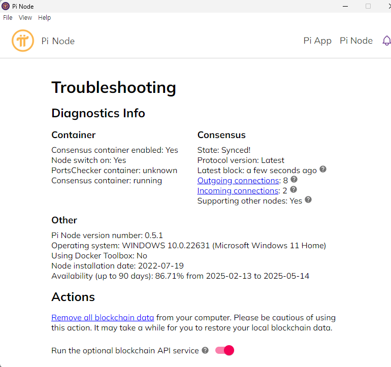 Pi Node version number:--- 나의 PC에 설치된 파이노드 프로그램의 버전을 표시