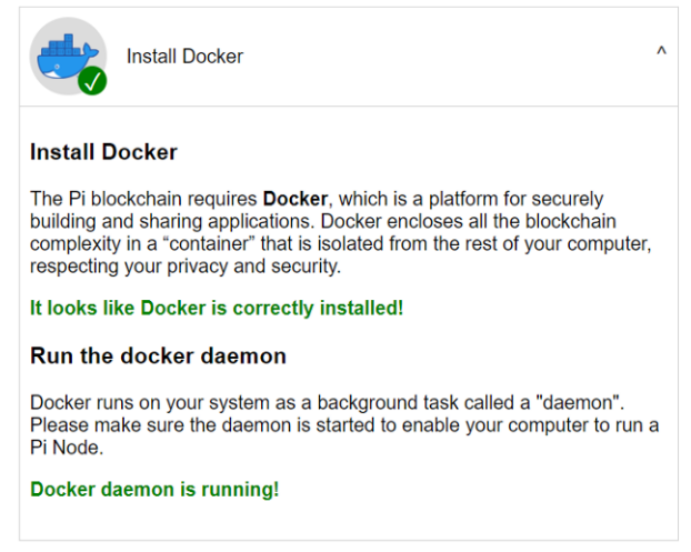 • 정상 설치 시 초록색 메시지 "It looks like Docker is correctly installed!"
