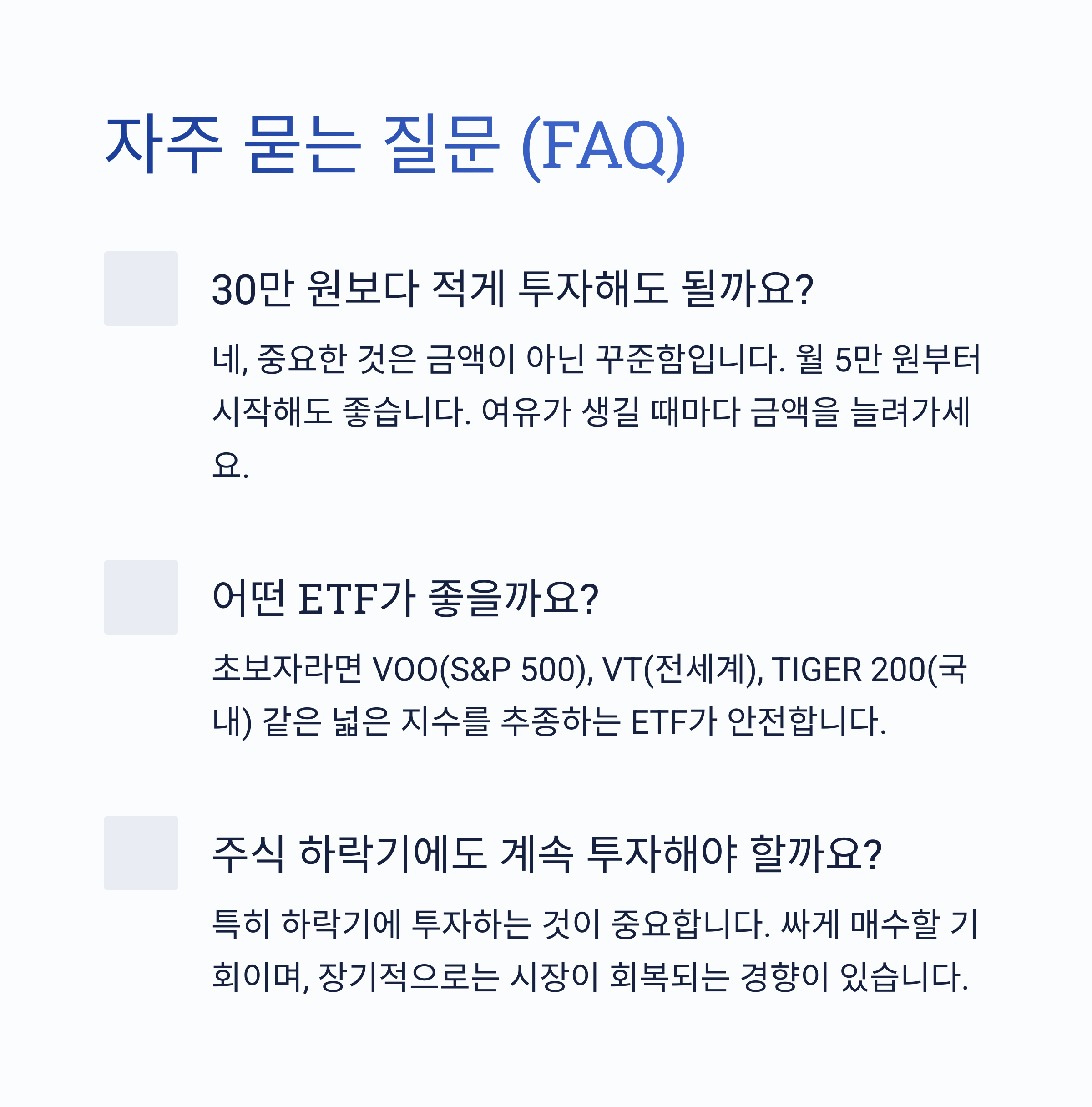 월 30만 원이라는 금액은 작아 보일 수 있지만, 자동투자 루틴으로 실행된다면 여러분의 자산에 커다란 변화를 가져올 수 있습니다. 중요한 것은 ‘얼마를 하느냐’가 아니라 ‘지속 가능한 습관’입니다. 투자에 대한 두려움은 정보와 경험으로 줄일 수 있습니다. 지금 시작하지 않으면 내일도 늦을 수 있습니다. 오늘부터 작은 실천을 통해 여러분만의 경제적 자유를 만들어보세요.