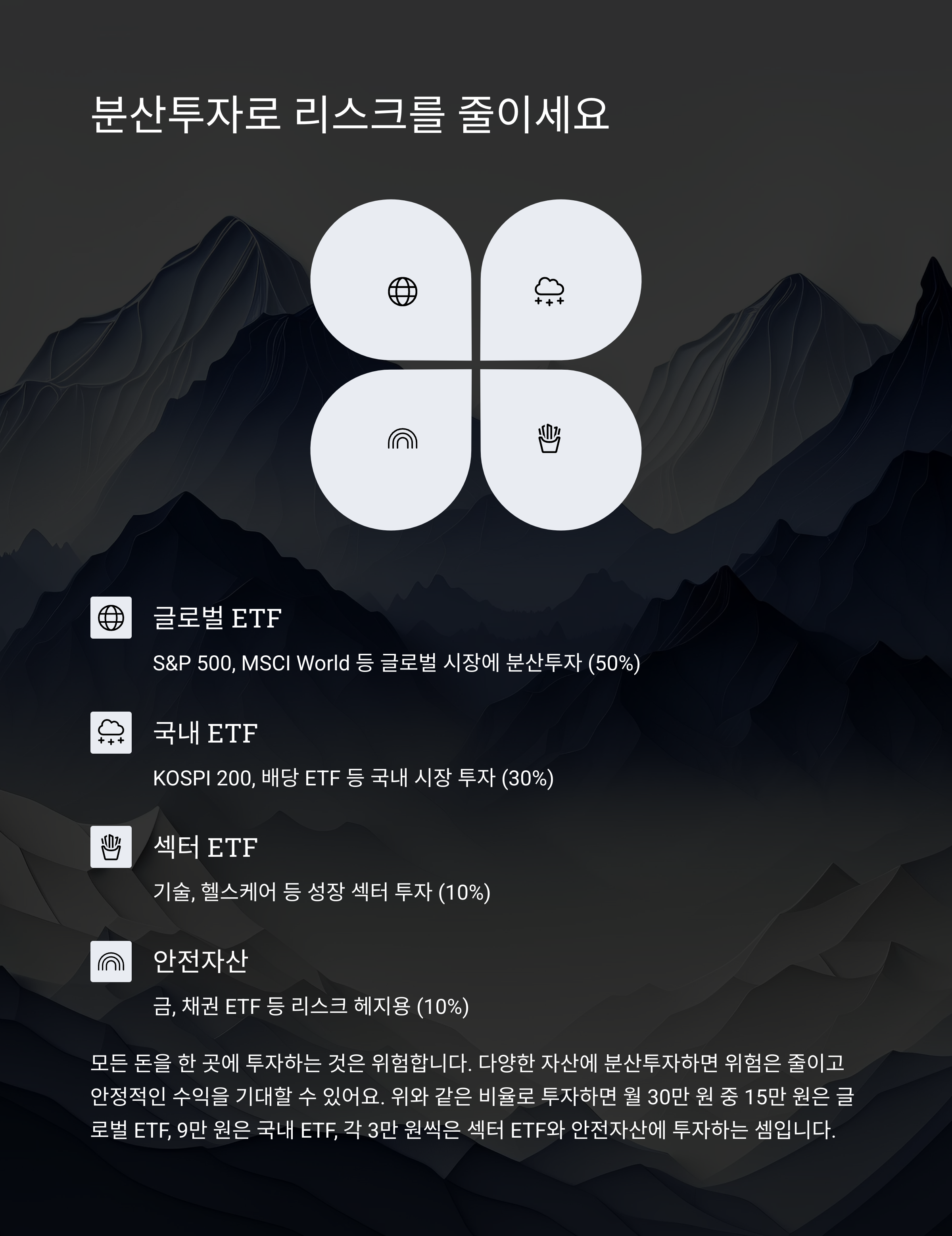 | 자동으로 꾸준히 투자되어 습관 형성에 효과적입니다. | 타이거 ETF, S&P500 지수 펀드 등이 대표적입니다. | 목표 설정과 감정 통제가 핵심입니다. |