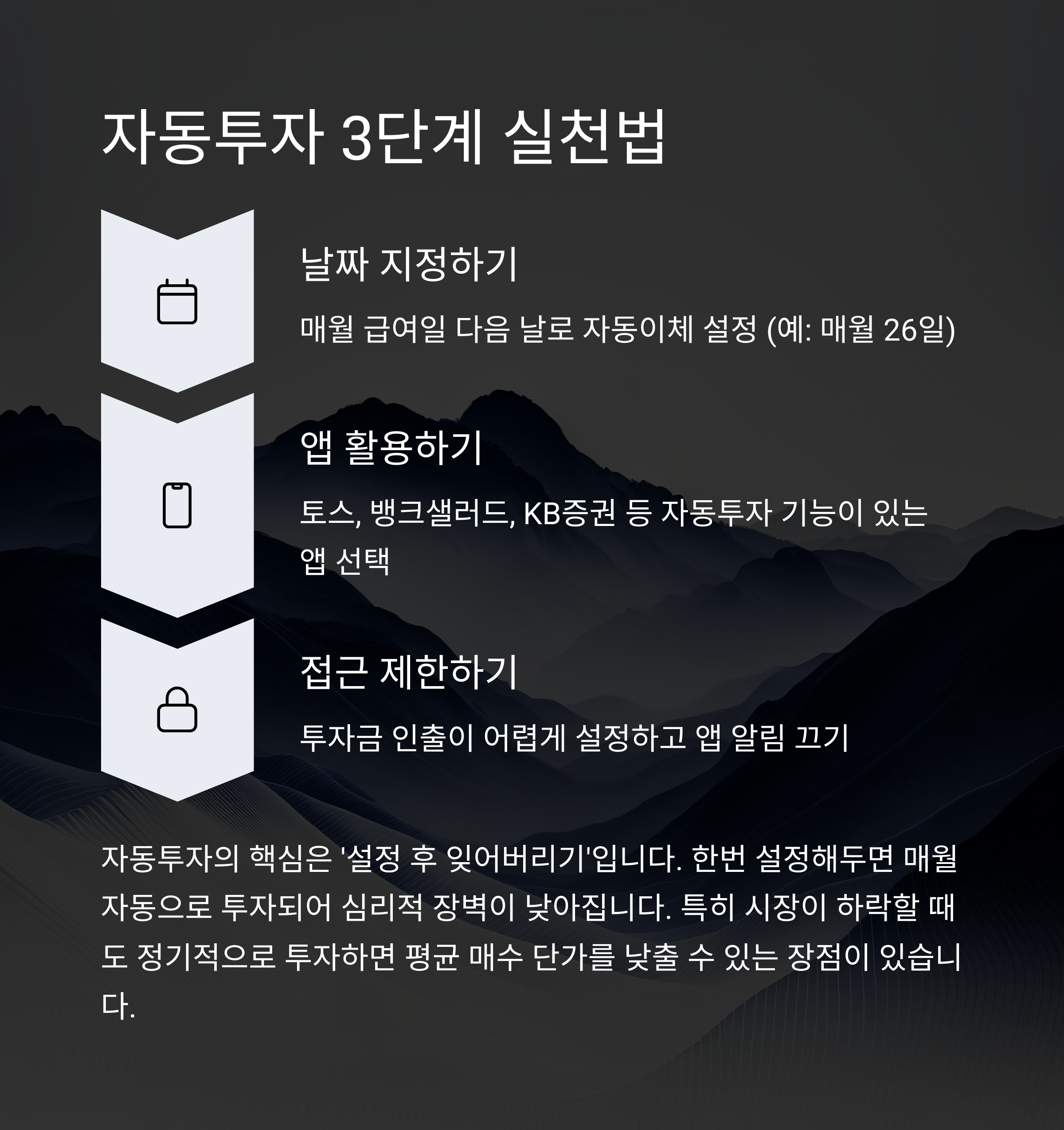 | 투자 타이밍에 흔들리지 않게 해줍니다. | 수수료가 낮고 분산 효과가 있는 상품을 고르세요. | 반복 가능한 루틴을 만드는 것이 중요합니다. |