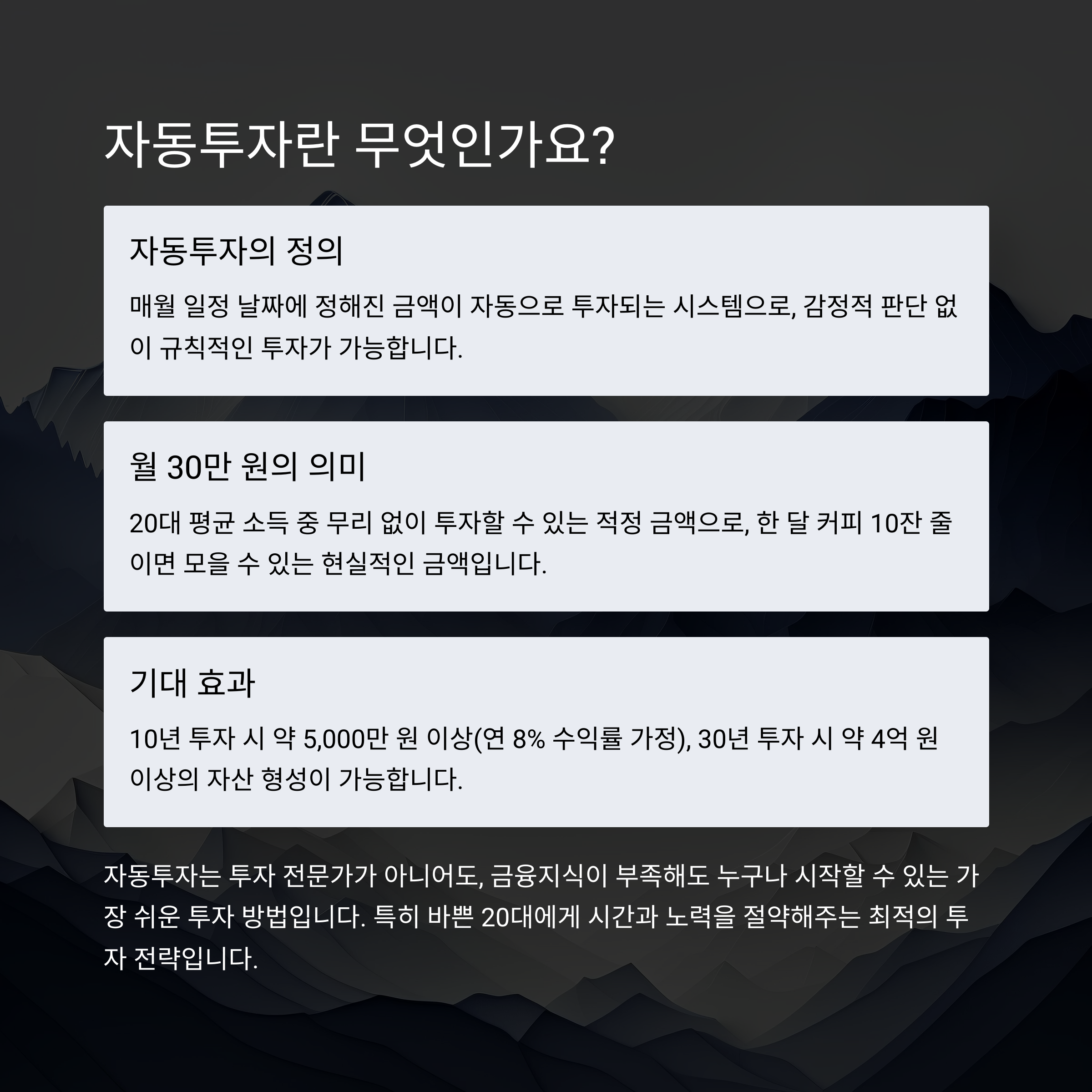 많은 20대 분들이 투자의 필요성은 느끼고 있지만, 막상 시작하려니 두려움이 앞서곤 합니다. 특히 매달 고정적인 수입이 적거나, 생활비로 빠듯한 환경 속에서는 투자는 사치처럼 느껴질 수 있습니다. 하지만 지금 소개드릴 루틴은 한 달에 단 30만 원으로도 충분히 가능한 현실적인 자동투자 방법입니다. 단순히 이론에 그치지 않고, 실제 제가 경험하고 실행해 온 내용을 바탕으로 정리해 드릴 예정이니, 투자 초보자분들도 부담 없이 따라오실 수 있을 거예요. 이제 막 사회에 진입한 20대, 혹은 자산 형성을 시작하려는 분들께 유용한 가이드가 되기를 바랍니다.
