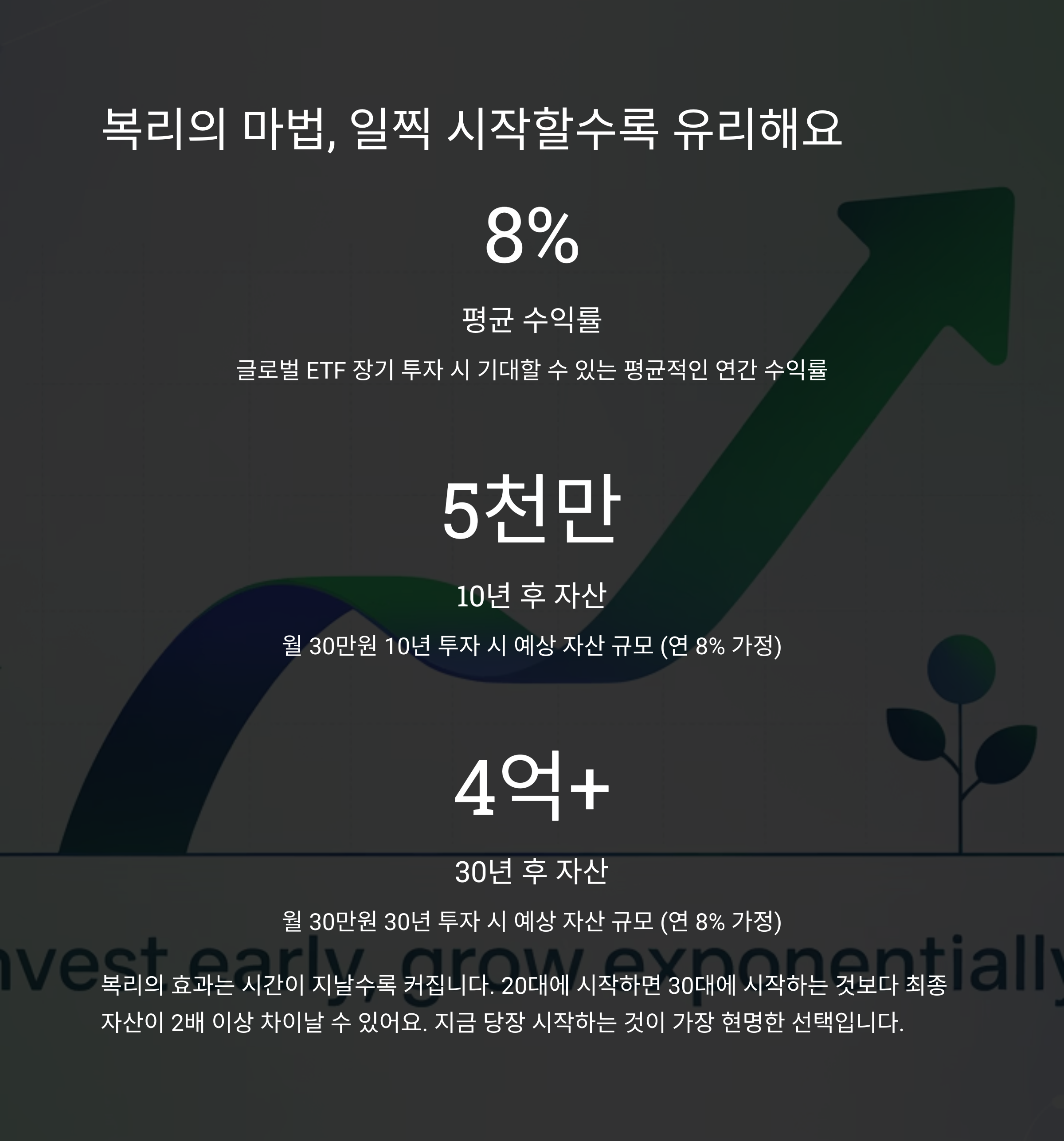 월 30만 원이라는 금액은 작아 보일 수 있지만, 자동투자 루틴으로 실행된다면 여러분의 자산에 커다란 변화를 가져올 수 있습니다. 중요한 것은 ‘얼마를 하느냐’가 아니라 ‘지속 가능한 습관’입니다. 투자에 대한 두려움은 정보와 경험으로 줄일 수 있습니다. 지금 시작하지 않으면 내일도 늦을 수 있습니다. 오늘부터 작은 실천을 통해 여러분만의 경제적 자유를 만들어보세요.