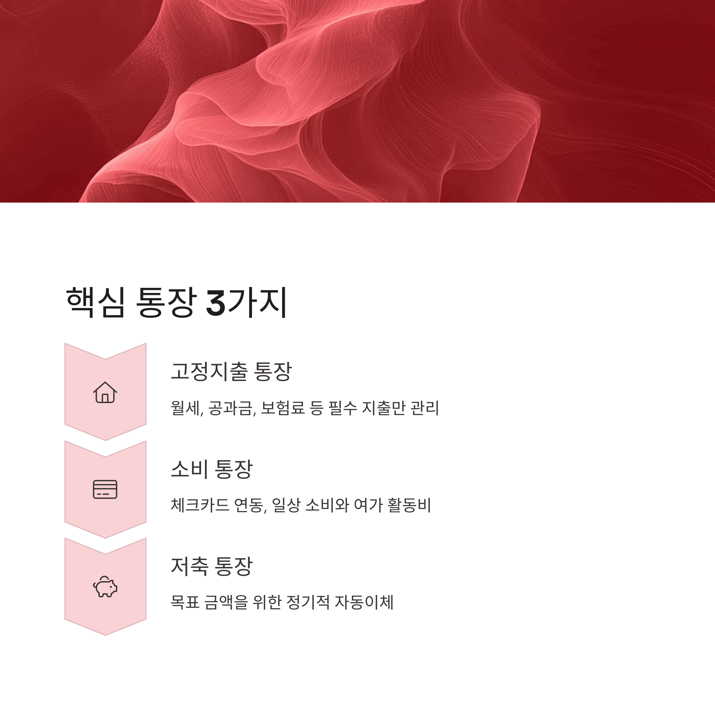 | 월세, 공과금 등 필수 지출을 관리하는 통장입니다. | 체크카드와 연결해 사용량을 통제하는 통장입니다. | 목표 저축액을 꾸준히 모으는 용도의 통장입니다. |